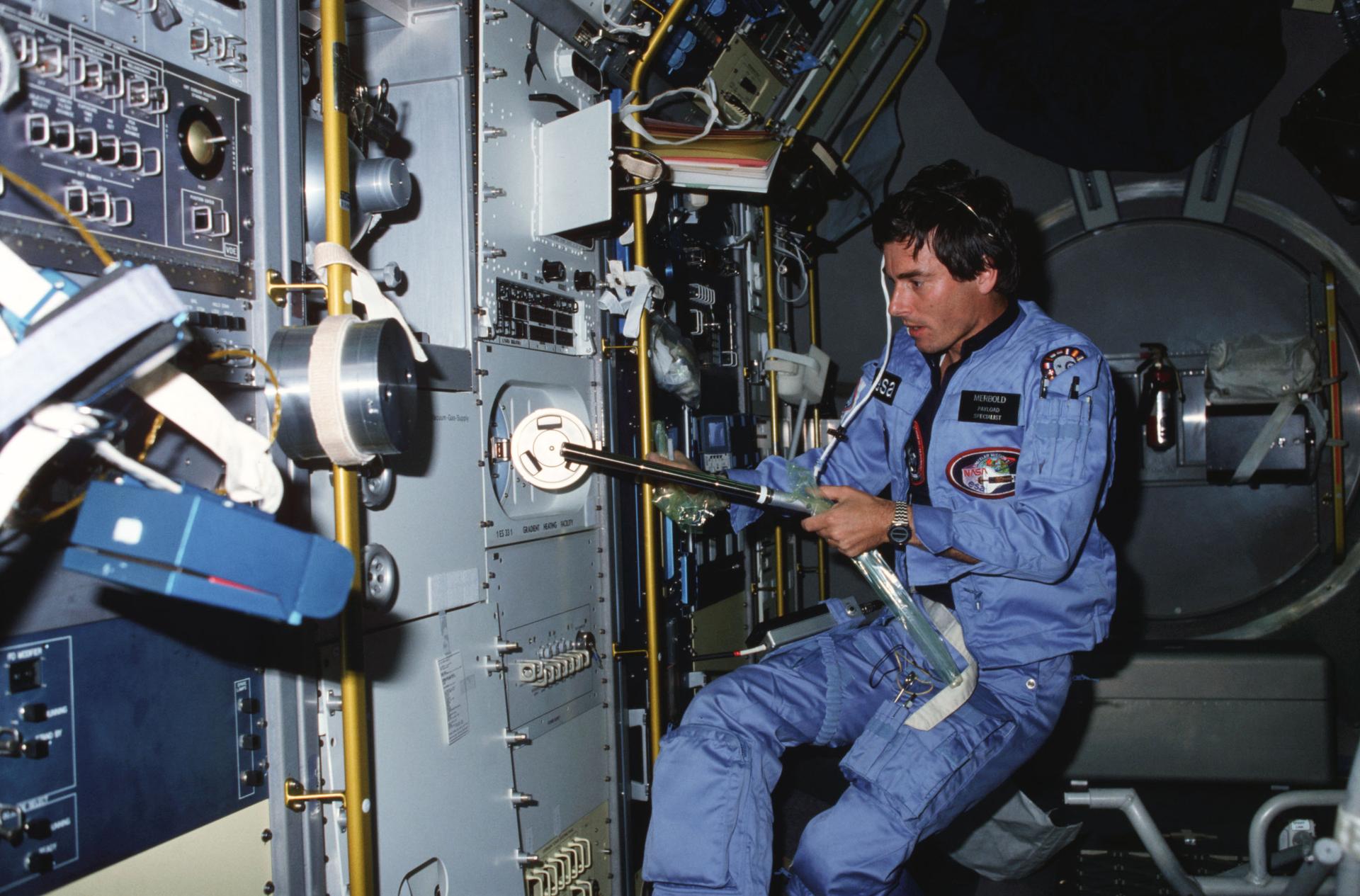 Payload specialist Merbold performing experiment in Spacelab
