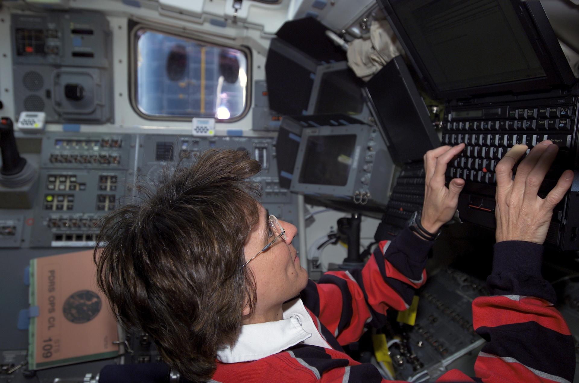 STS109-E-5291 (1-12 March 2002) --- Astronaut Nancy J. Currie, STS-109 mission specialist, works with Payload and General Support Computers (PGSC) on the mid deck of the Space Shuttle Columbia. The image was taken with digital still camera.