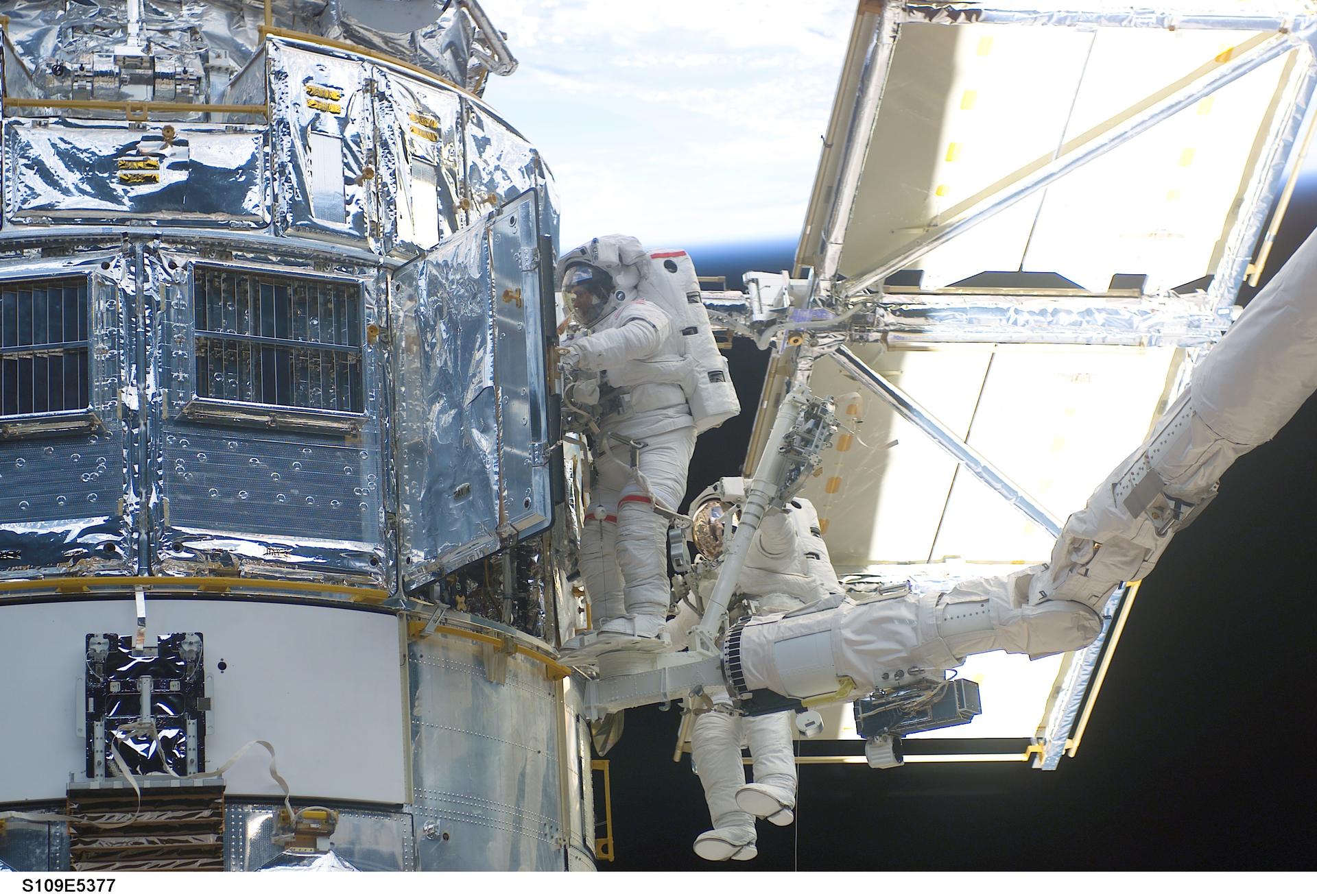 STS109-E-5377 (6 March 2002) --- Astronaut John M. Grunsfeld, payload commander, works in tandem with astronaut Richard M. Linnehan, mission specialist, as the two devote their attention to the Power Control Unit replacement task on the giant Hubble Space Telescope (HST). Grunsfeld stands on a foot restraint on the end of the Space Shuttle Columbia's Remote Manipulator System (RMS). This marked the third of five scheduled STS-109 space walks and the mission's second extravehicular activity (EVA) for the tandem of Grunsfeld and Linnehan. It was completed at 9:16 a.m. CST (1516 GMT), Mar. 6, 2002. The image was recorded with a digital still camera.