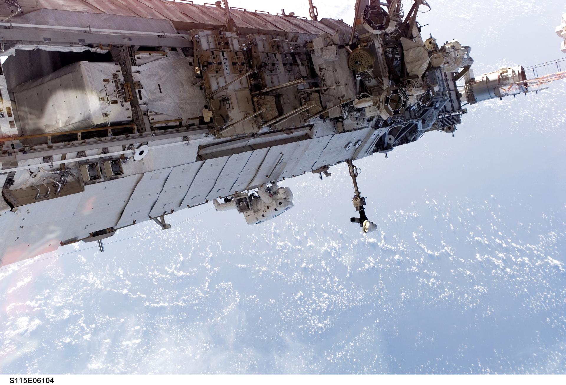 S115-E-06104 (15 Sept. 2006) --- In the center of this panoramic scene of new hardware on the International Space Station, astronaut Heidemarie M. Stefanyshyn-Piper, mission specialist, participates in the final of three scheduled STS-115 space walks.