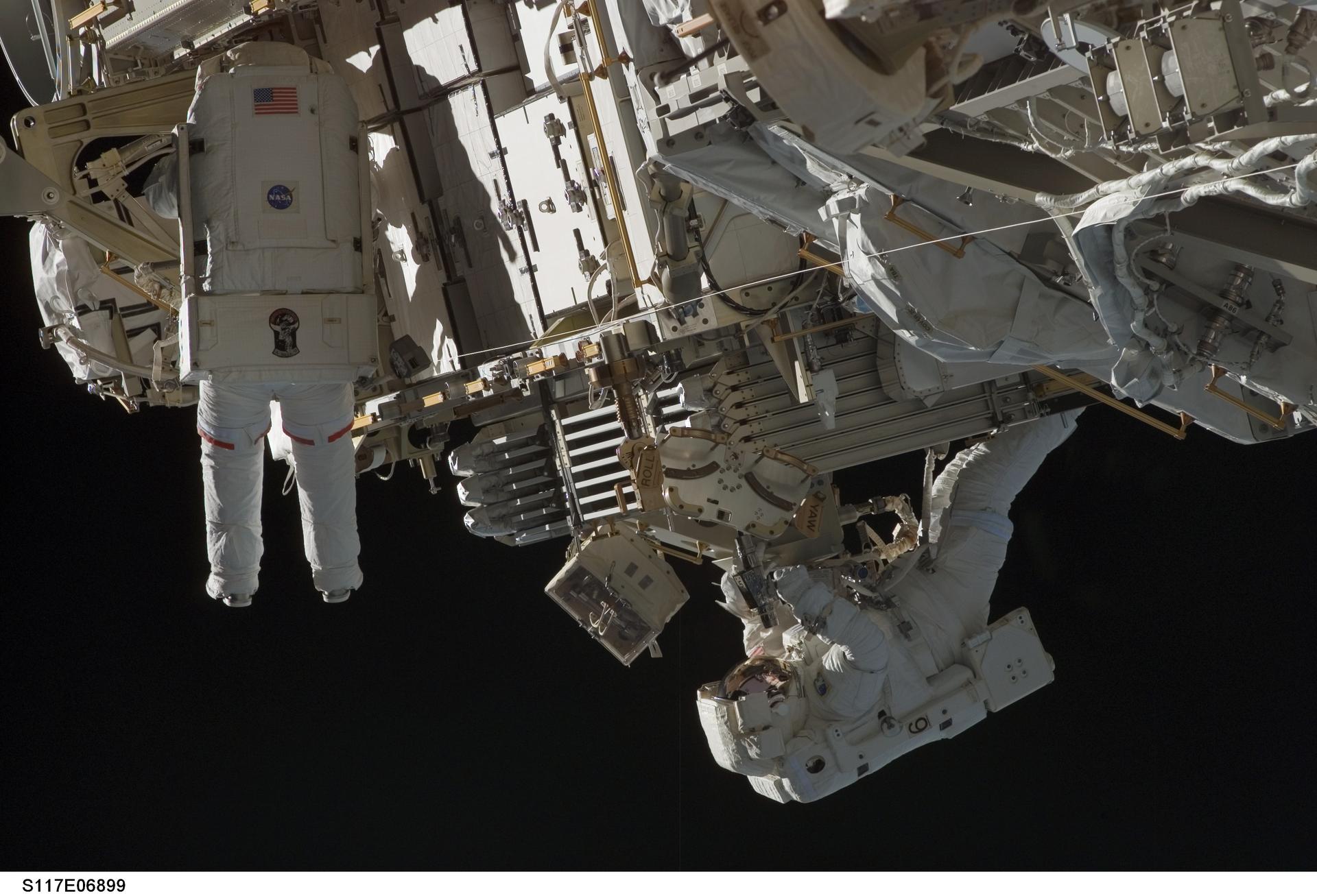 S117-E-06899 (11 June 2007) --- Astronauts Jim Reilly (left) and John "Danny" Olivas (bottom right), both STS-117 mission specialists, participate in the mission's first planned session of extravehicular activity (EVA), as construction resumes on the International Space Station. Among other tasks, Reilly and Olivas connected power, data and cooling cables between S1 and S3; released the launch restraints from and deployed the four solar array blanket boxes on S4 and released the cinches and winches holding the photovoltaic radiator on S4.