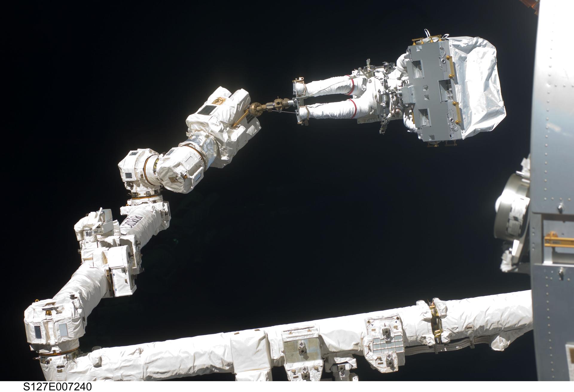 S127-E-007240 (20 July 2009) --- During the second STS-127 spacewalk, astronauts Dave Wolf and Tom Marshburn (out of frame), with help from their crewmates inside the International Space Station and the Space Shuttle Endeavour, transported the Linear Drive Unit (LDU) and two other parts to the station's External Stowage Platform 3 for long-term storage. Wolf is standing on the end of Canadarm2, which is anchored on the orbital outpost.