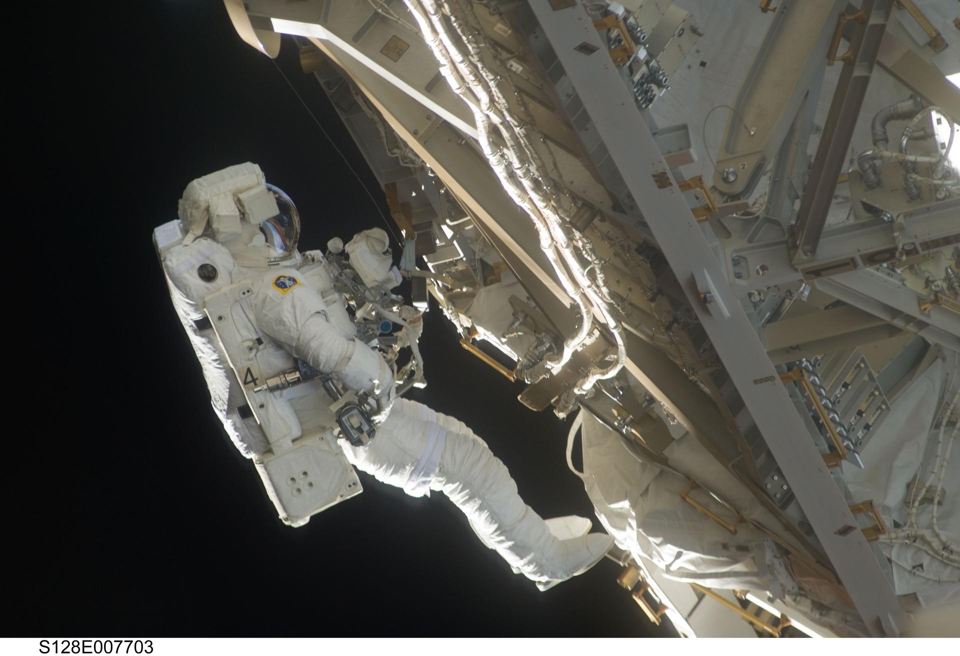 S128-E-007703 (5 Sept. 2009) --- European Space Agency astronaut Christer Fuglesang, STS-128 mission specialist, participates in the mission's third and final session of extravehicular activity (EVA) as construction and maintenance continue on the International Space Station. During the seven-hour, one-minute spacewalk, Fuglesang and NASA astronaut John “Danny” Olivas (out of frame), mission specialist, deployed the Payload Attachment System (PAS), replaced the Rate Gyro Assembly #2, installed two GPS antennae and did some work to prepare for the installation of Node 3 next year. During connection of one of two sets of avionics cables for Node 3, one of the connectors could not be mated. This cable and connector were wrapped in a protective sleeve and safed. All other cables were mated successfully.