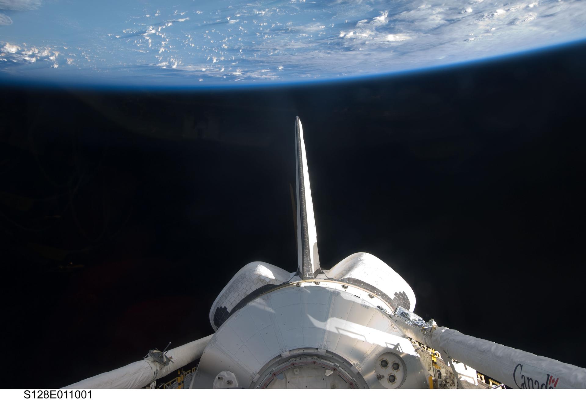 S128-E-011001 (9 Sept. 2009) --- Backdropped by Earth's horizon and the blackness of space, the Leonardo Multi-Purpose Logistics Module visible in Space Shuttle Discovery's payload bay, vertical stabilizer, orbital maneuvering system (OMS) pods and Remote Manipulator System/Orbiter Boom Sensor System (RMS/OBSS) are featured in this image photographed by an STS-128 crew member from an aft flight deck window.
