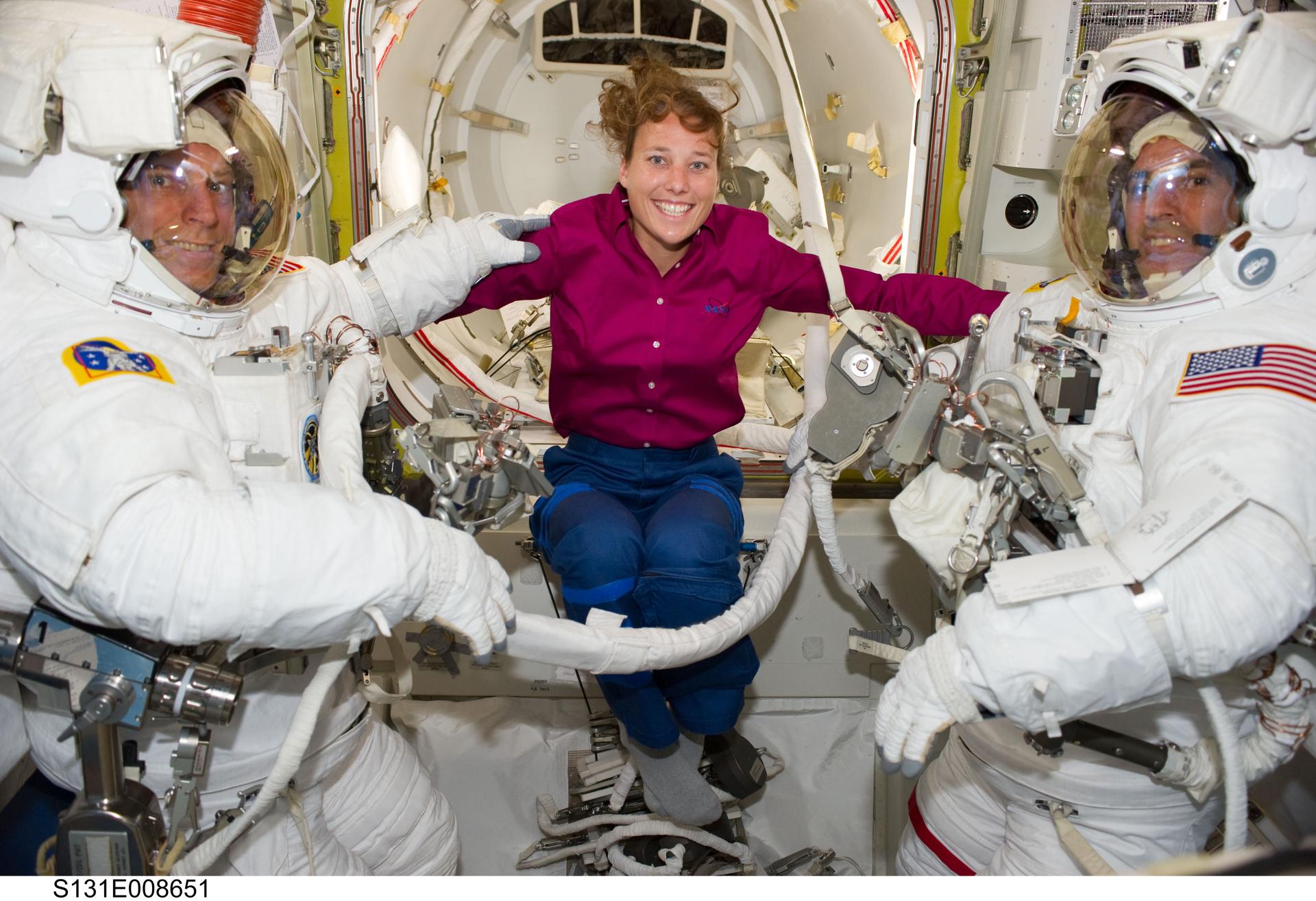 S131-E-008651 (11 April 2010) --- NASA astronauts Clayton Anderson (left) and Rick Mastracchio, both STS-131 mission specialists, attired in their Extravehicular Mobility Unit (EMU) spacesuits; along with astronaut Dorothy Metcalf-Lindenburger, mission specialist, are pictured in the Quest airlock of the International Space Station prior to the start of the mission's second spacewalk.