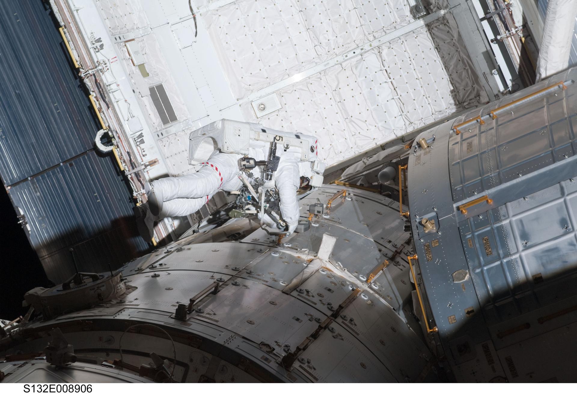 S132-E-008906 (21 May 2010) --- NASA astronaut Michael Good, STS-132 mission specialist, participates in the mission’s third and final session of extravehicular activity (EVA) as construction and maintenance continue on the International Space Station. During the six-hour, 46-minute spacewalk, Good and NASA astronaut Garrett Reisman (out of frame), mission specialist, completed the installation of the final two of the six new batteries for the B side of the port 6 solar array. In addition, the astronauts installed a backup ammonia jumper cable between the port 4 and 5 trusses of the station, transferred a Power and Data Grapple Fixture from the shuttle to the station, and reconfigured some tools.