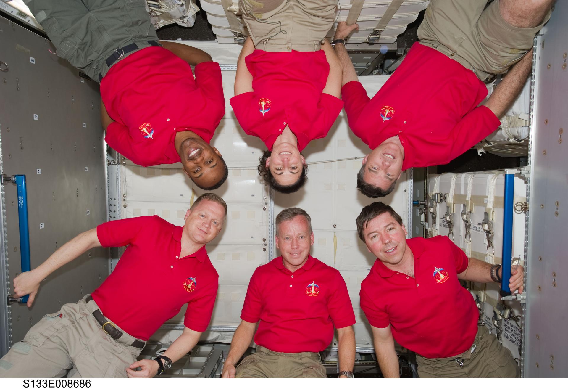 S133-E-008686 (4 March 2011) --- Inside the newly-installed Permanent Multipurpose Module (PMM) on the International Space Station are the six crew members of the STS-133 crew who've been spending busy days with the six astronauts and cosmonauts of Expedition 26 (out of frame). At bottom, from the left, are astronauts Eric Boe, Steve Lindsey and Michael Barratt. On top are astronauts Alvin Drew, Nicole Stott and Steve Bowen. Photo credit: NASA or National Aeronautics and Space Administration