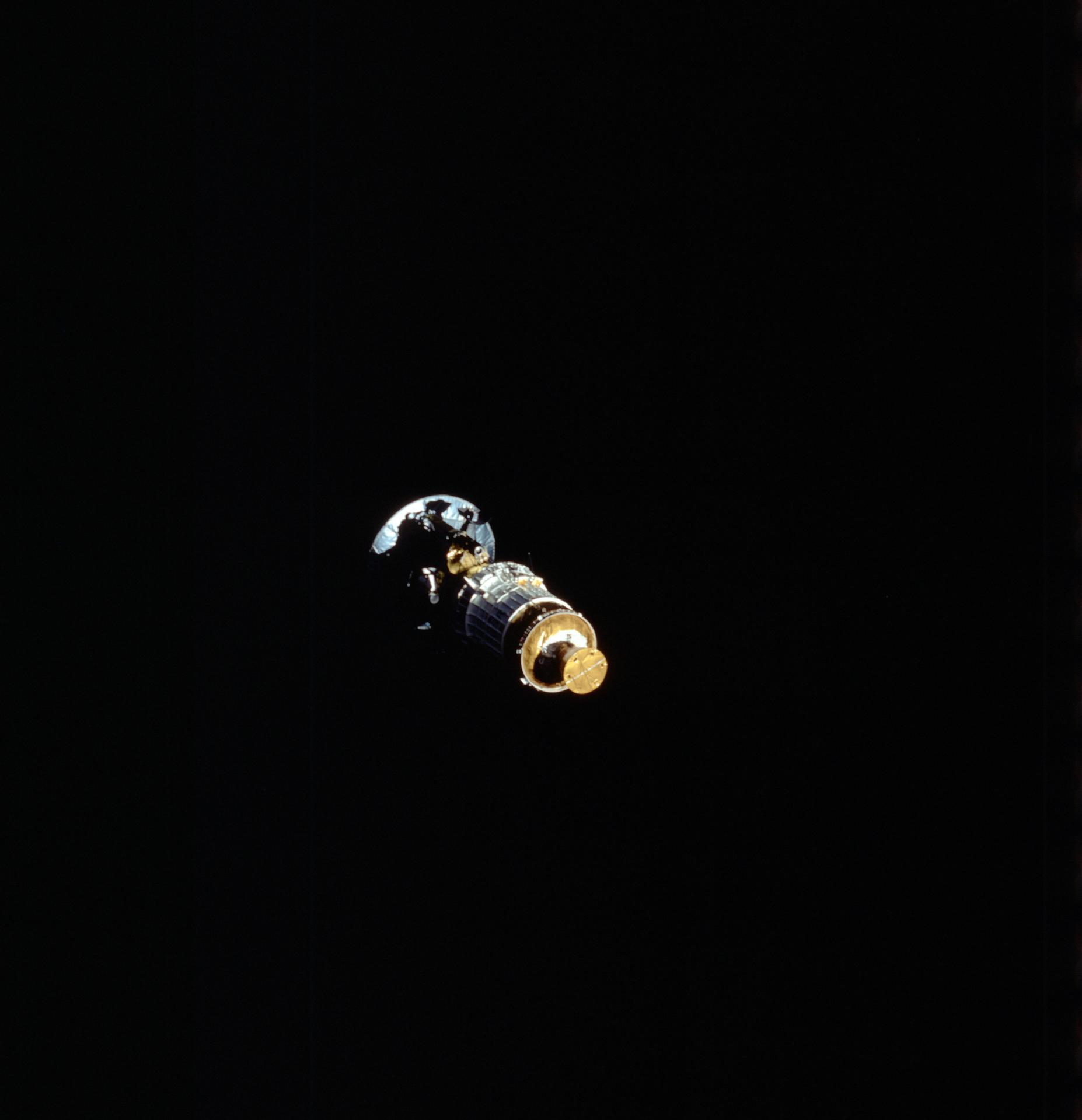 STS034-72-070 (18 Oct 1989) --- Backdropped against the blackness of space, the Galileo spacecraft and its inertial upper stage (IUS) begin relative separation from the Earth-orbiting Space Shuttle Atlantis. The five-member STS-34 crew deployed the Jupiter-bound satellite within six hours of achieving Earth orbit on Oct. 18, 1989. The scene was exposed with a 70mm handheld Hasselblad camera.