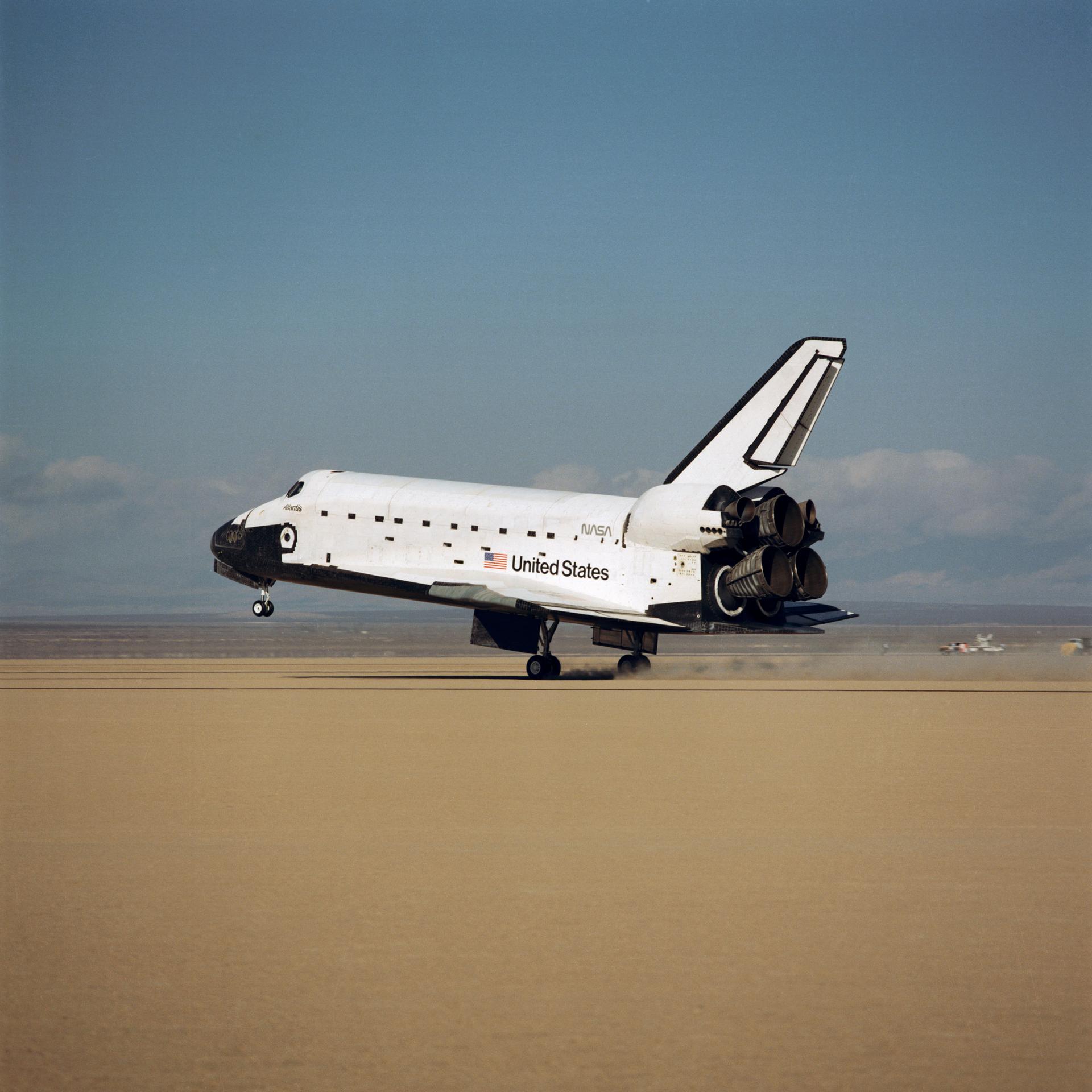 STS-34 Atlantis, Orbiter Vehicle (OV) 104, main landing gear (MLG) touches down on Runway 23 dry lake bed at Edwards Air Force Base (EAFB), California. The nose landing gear rides above runway before touchdown as the MLG wheels produce a cloud of dust. OV-104's port side profile is captured as it glides by at a speed of approximately 195 knots (224 miles per hour). The tail section with deployed speedbrake/rudder and space shuttle main engines (SSMEs) are visible.