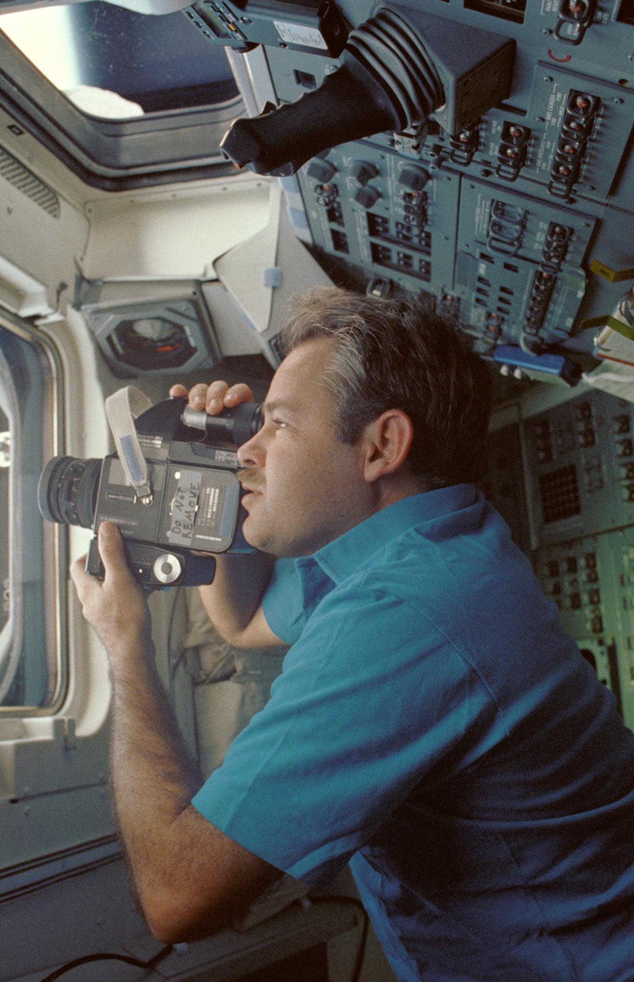 STS-36 Commander Creighton uses 70mm HASSELBLAD camera on flight deck