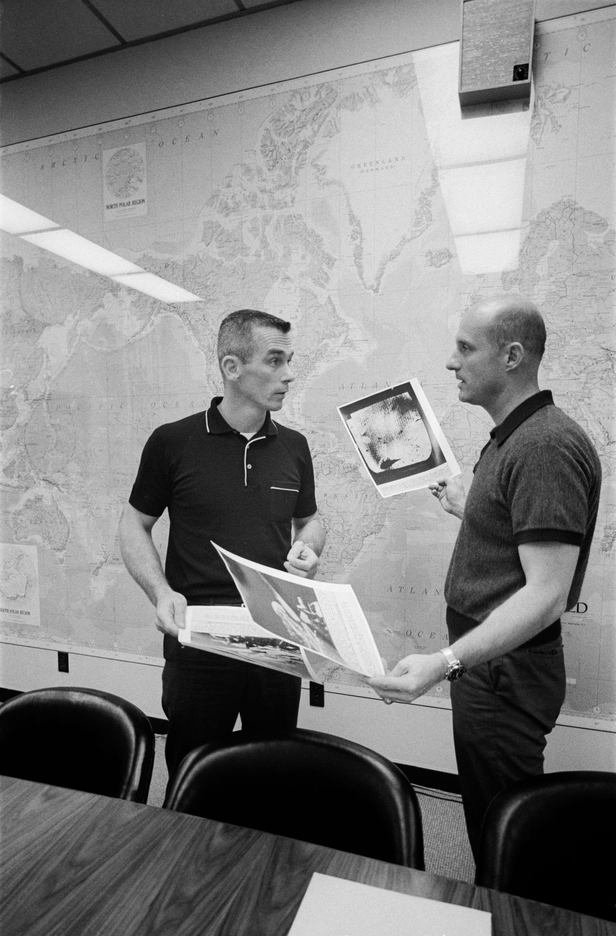 S66-32144 (2 June 1966) --- Astronauts Thomas P. Stafford (right) and Eugene A. Cernan look over pictures of the lunar surface taken by Surveyor I. Photo credit: NASA
