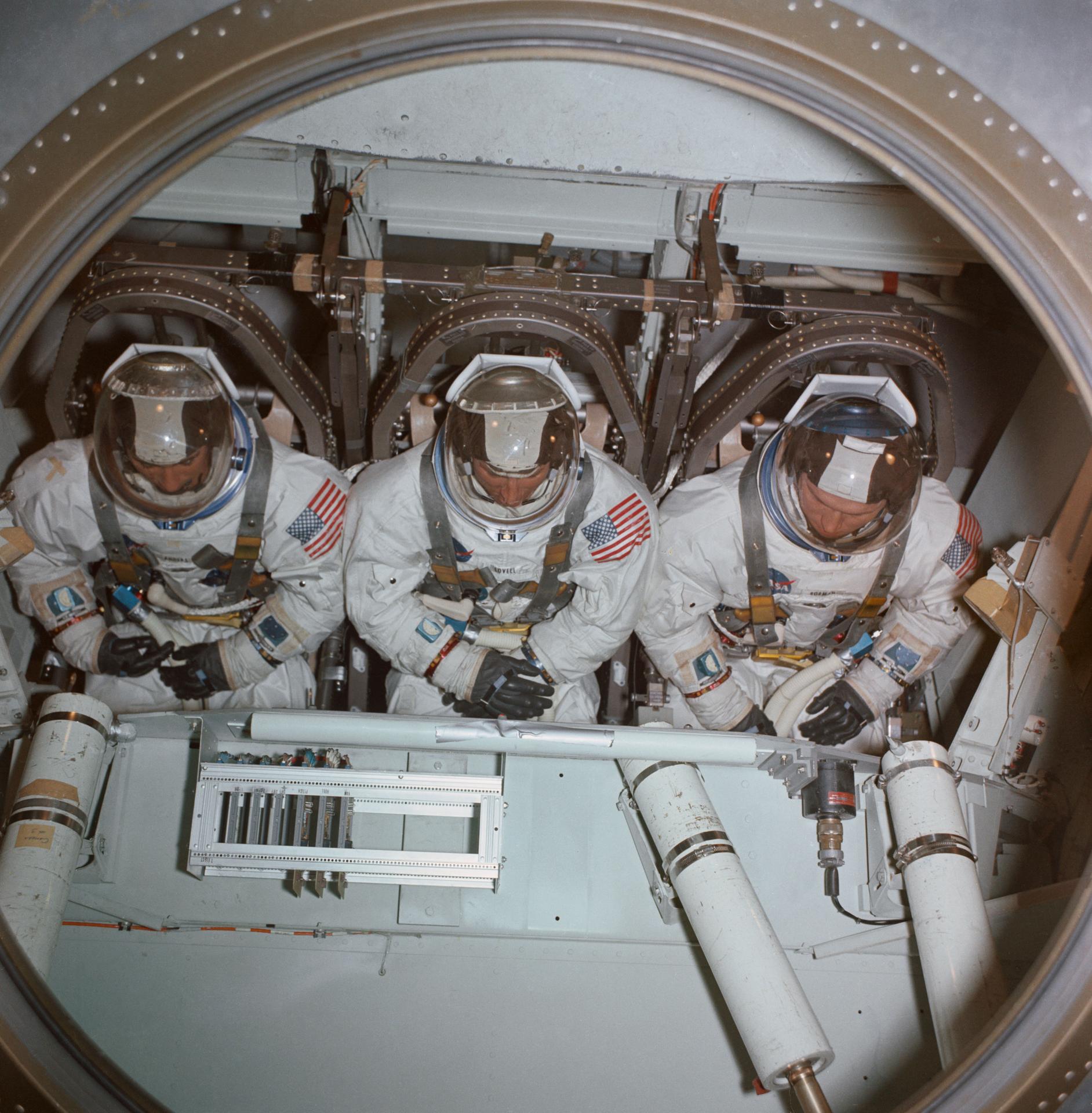 Apollo 8 prime crew inside centrifuge gondola in bldg 29 during training