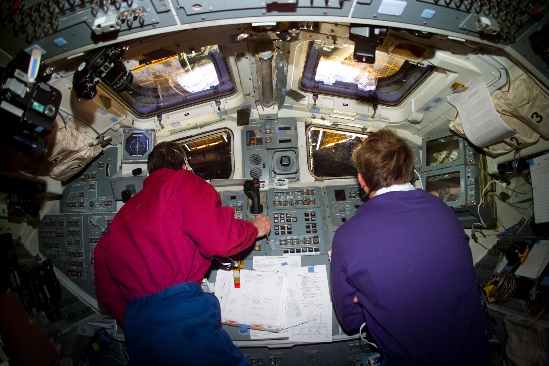 S82-E-5644 (17 Feb. 1997) --- Inside the Space Shuttle Discovery's cabin, astronauts Scott J. Horowitz (left), STS-82 pilot, and Mark C. Lee, payload commander, monitor the mission's fourth Extravehicular Activity (EVA) to service Hubble Space Telescope (HST). This view was taken with an Electronic Still Camera (ESC).