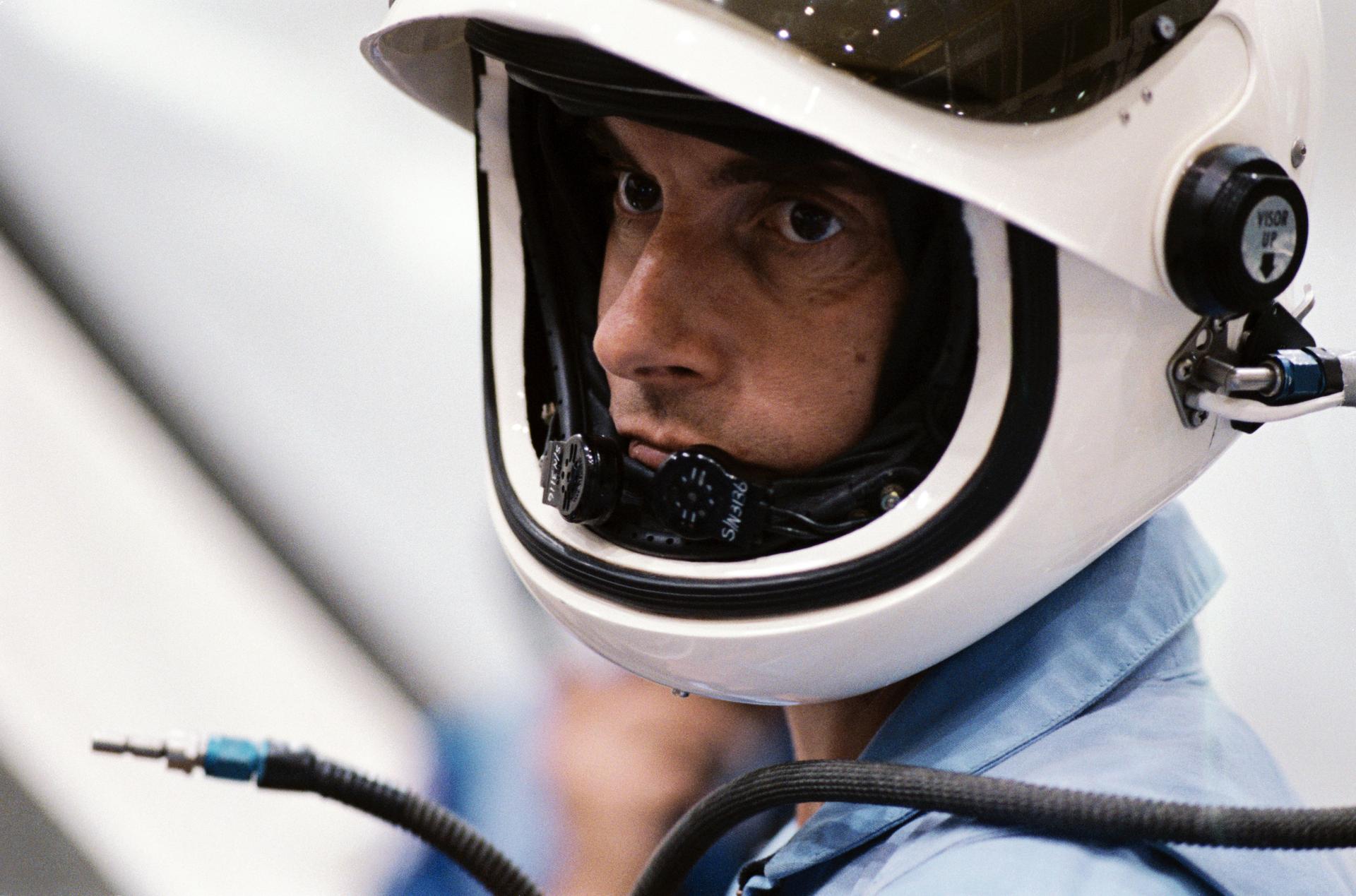 S83-41190 (9 September 1983) --- A close-up view of the serious countenance of West German Physicist Ulf Merbold was captured during a training session with all six STS-9 crewmembers in the Johnson Space Centers (JSC) Shuttle Mockup and Integration Laboratory. Dr. Merbold is SL-1 payload specialist representing the European Space Agency (ESA). Dr. Merbold, from Max-Planck Institute in Stuttgart, is a specialist in crystal lattice defects and low-temperature physics. The photograph was taken by Otis Imboden.