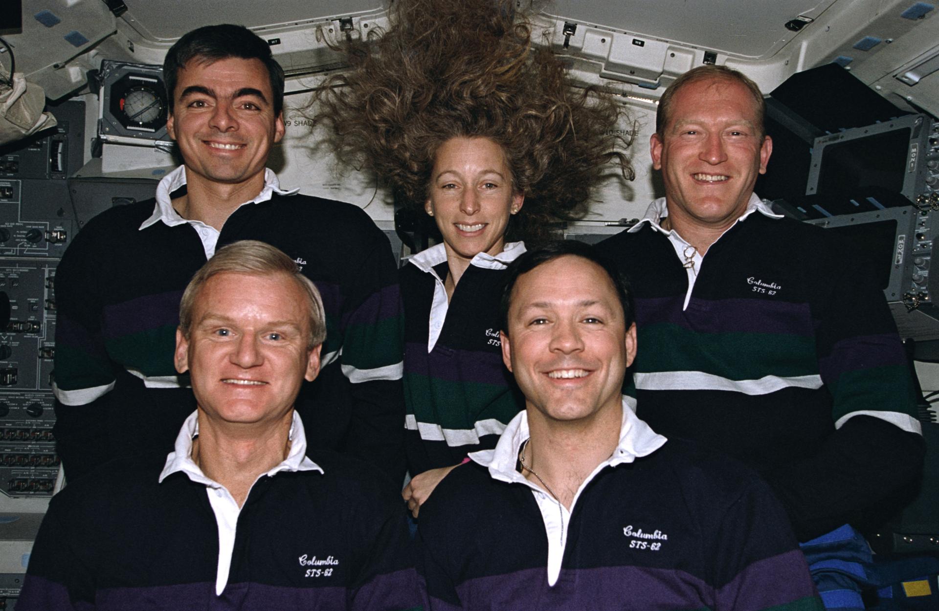 STS062-17-025 (4-18 March 1994) --- The five veteran astronaut crewmembers for NASA's STS-62 mission pose for the traditional inflight portrait on Columbia's aft flight deck. In front are astronauts John H. Casper (left), mission commander; and Pierre J. Thuot, mission specialist. In the rear are astronauts (left to right) Andrew M. Allen, pilot; Marsha S. Ivins and Charles D. (Sam) Gemar, mission specialists.