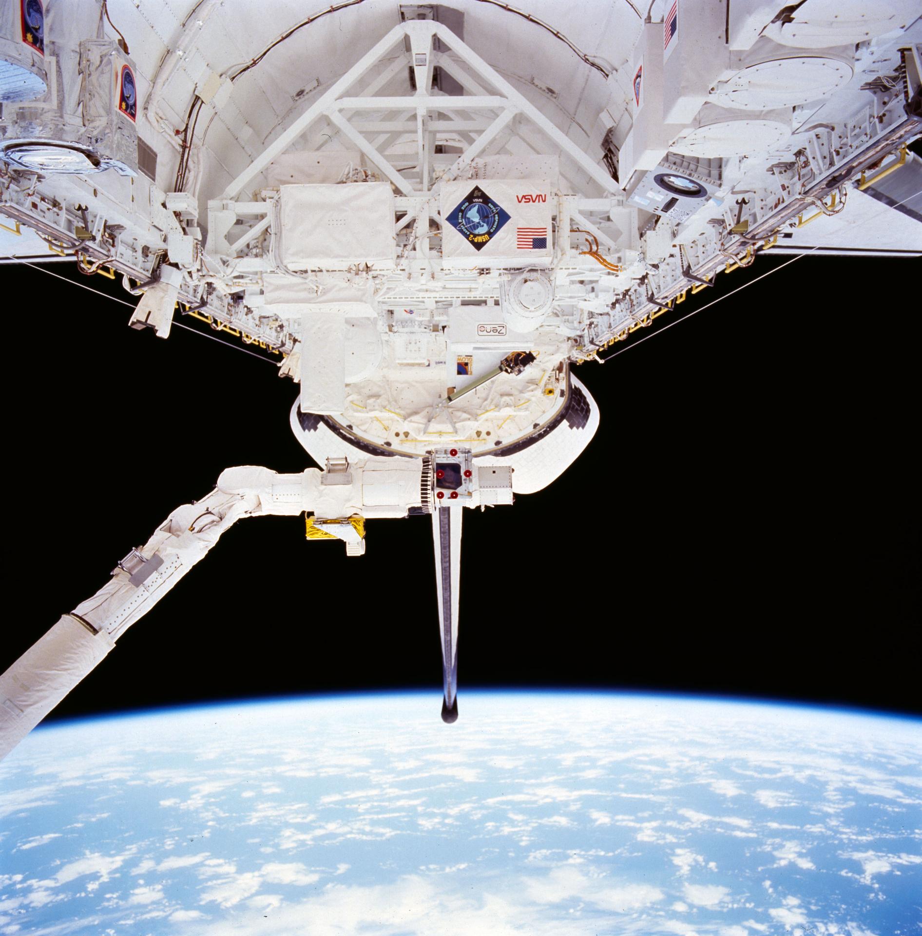 STS062-81-024 (4-18 March) --- This 70mm frame, photographed through the aft flight deck windows of the earth-orbiting Space Shuttle Columbia, features activity with the Dexterous End Effector (DEE) on the Remote Manipulator System (RMS). During this 14-day mission, three of the five STS-62 crewmembers took turns operating and observing the RMS in a series of one-hour sessions. Tasks involve aligning the arm with targets, grappling a test probe, inserting it into receptacles of progressively smaller clearances and applying force and torque to the probe with the arm. This scene also provides an overview of many of the United States Microgravity Payload 2 (USMF) elements as well as OAST-2 experiments.