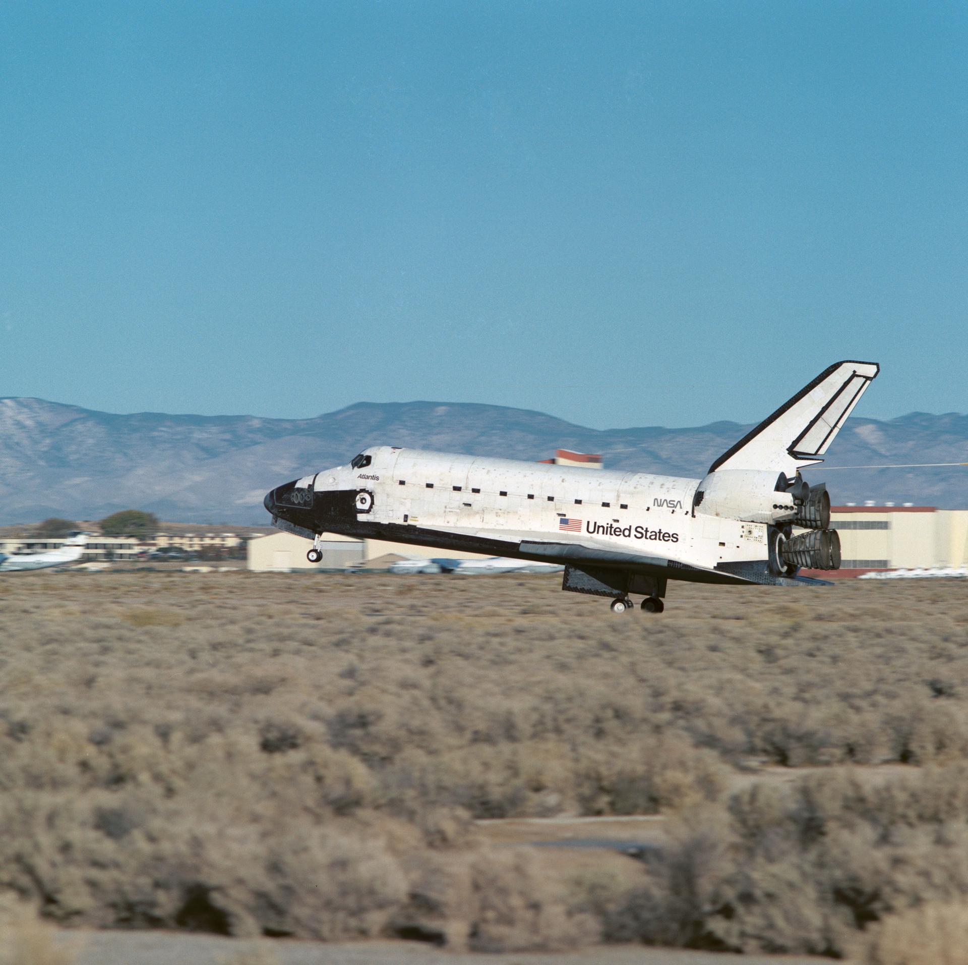 STS066-S-040 (14 November 1994) --- The main landing gear is on the ground and the nose gear is about to touch down as the Space Shuttle Atlantis heads toward a stop at Edwards Air Force Base in southern California, ending a successful 10 day, 22 hour and 34 minute space mission. Landing occurred at 7:34 a.m. (PST), November 14, 1994. Onboard were astronauts Donald R. McMonagle, commander; Curtis L. Brown, Jr., pilot; Ellen S. Ochoa, payload commander; Scott E. Parazynski and Joseph R. Tanner, both mission specialists, along with European Space Agency (ESA) mission specialist Jean-Francois Clervoy. The crew supported the Atmospheric Laboratory for Applications and Science (ATLAS-3) mission.