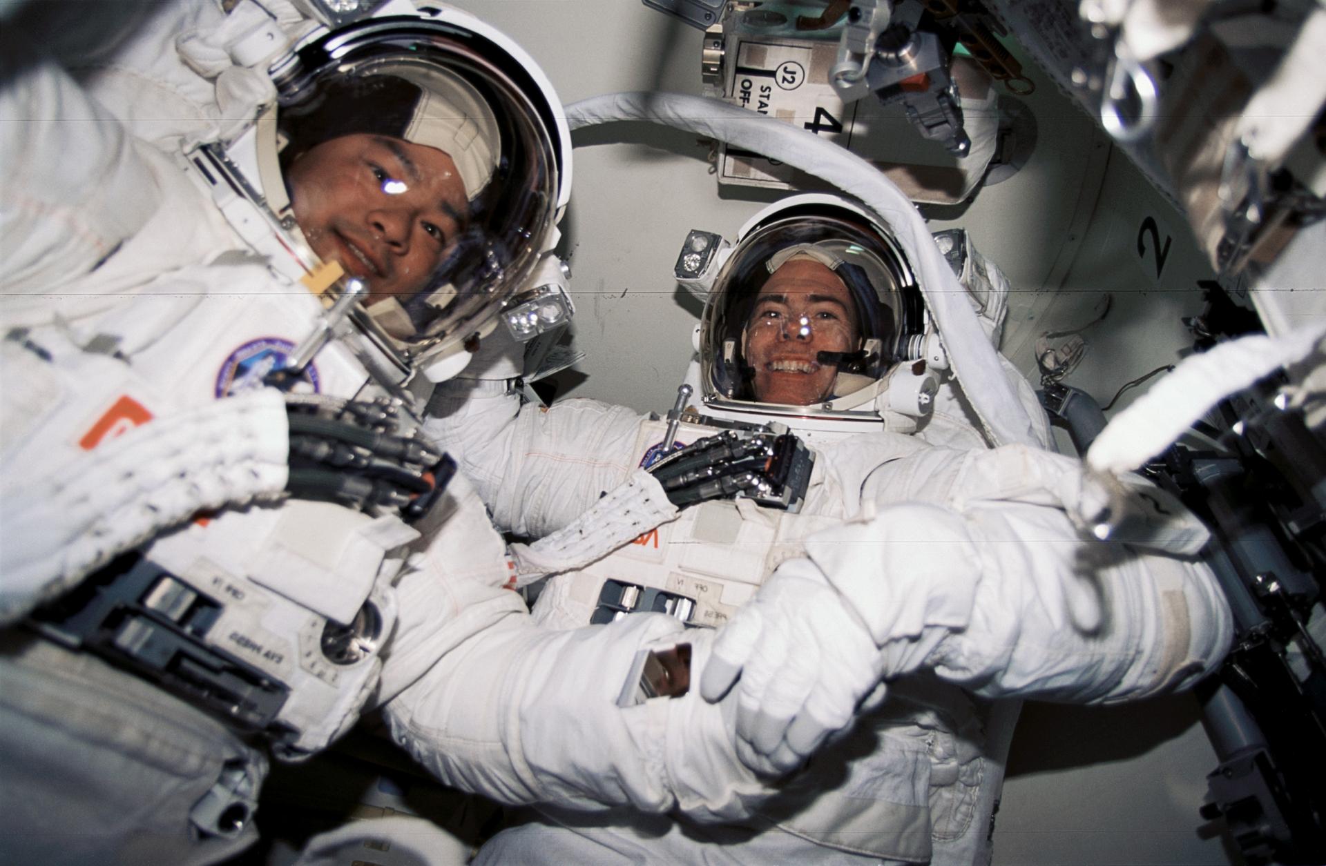 STS072-391-009 (15 Jan. 1996) --- In the Space Shuttle Endeavour's airlock, astronauts Leroy Chiao (left) and Daniel T. Barry prepare for the first extravehicular activity (EVA) scheduled on the mission. The two EVA's were scheduled to evaluate space station assembly techniques.