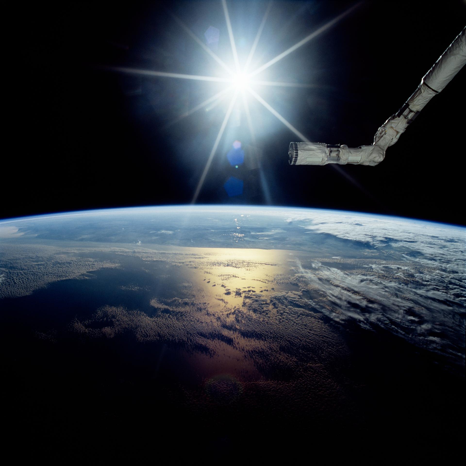 STS077-702-039 (19-29 May 1996) --- The Space Shuttle Endeavour?s Canadian-built Remote Manipulator System (RMS) arm is extended against a panoramic Earth/space background. In a traditional gesture, the view was chosen by the crew members to represent their unique position to view such scenes. A lengthy portion of the South African coast in Sun glint and a Sun burst/flare effect flank the end effector of the RMS.