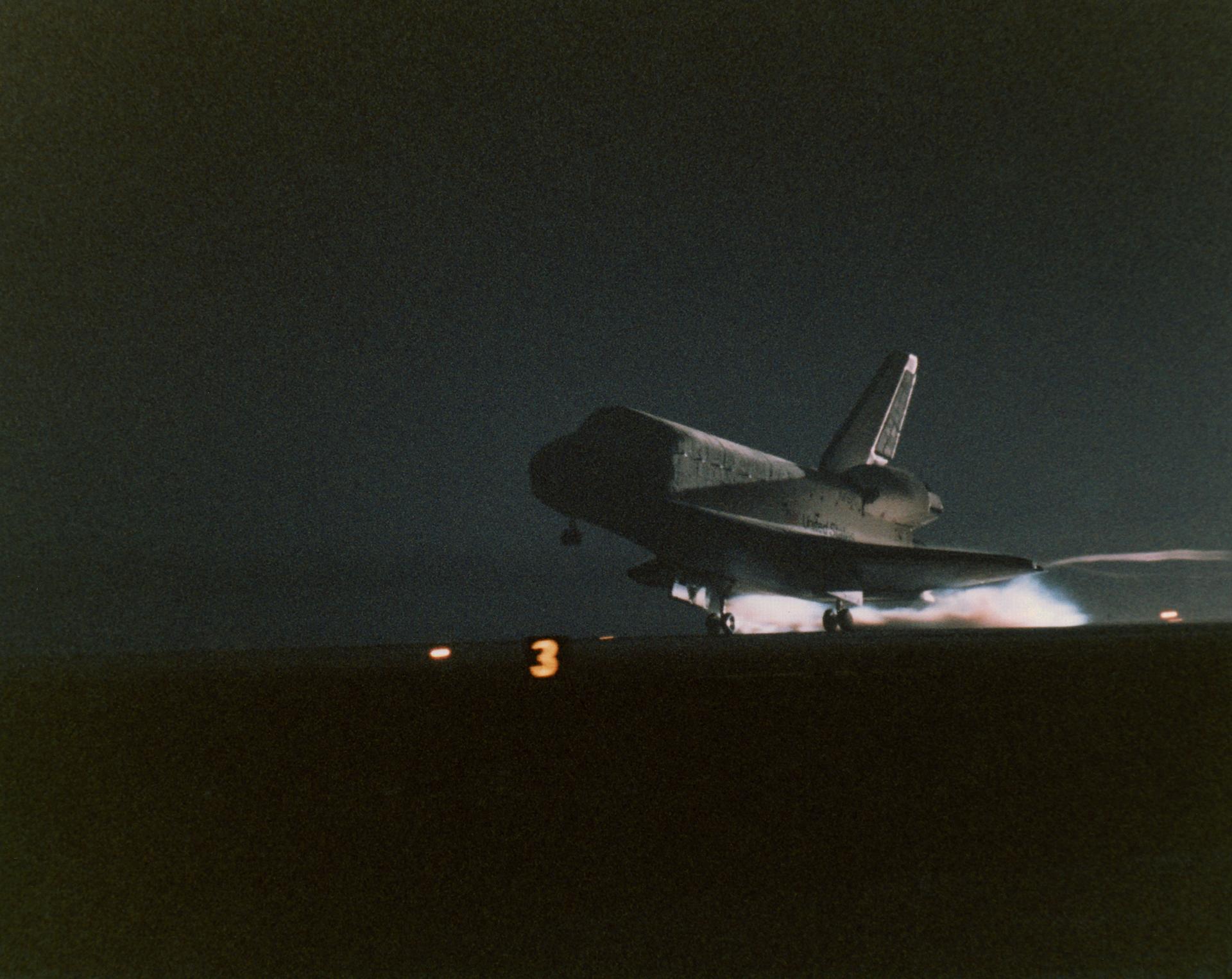 STS082-S-008 (21 Feb 1997) --- The Space Shuttle Discovery partially lights up the early morning sky as it as it lands on Runway 15 at the Kennedy Space Center (KSC), following a 10-day mission in Earth-orbit. Landing occurred at 3:32:26 a.m. (EST), February 21, 1997. The crew members are astronauts Kenneth D. Bowersox, commander; Scott J. Horowitz, pilot; Mark C. Lee, payload commander; and mission specialists Steven A. Hawley, Gregory J. Harbaugh, Steven L. Smith and Joseph R. Tanner. The primary mission of the flight was to service the Hubble Space Telescope (HST) - a task which required five Extravehicular Activities (EVA) (including an unscheduled EVA) of two alternating two-member teams. STS-82 represents the 22nd flight of Discovery and the 82nd Space Transportation System (STS) flight, as well as the ninth nocturnal landing in STS history.