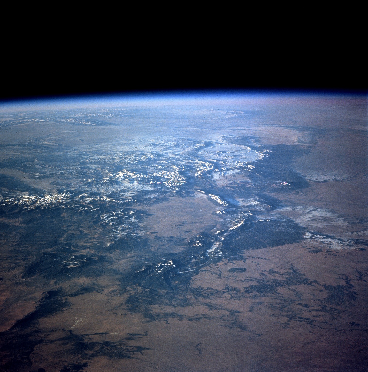 STS103-730-032 (19-27 December 1999) --- One of the astronauts aboard the Earth-orbiting Space Shuttle Discovery used a handheld 70mm camera to capture the southern to middle Rocky Mountains in low sunlight. The middle Rockies include the Big Horn range of Wyoming (snow capped range almost center of horizon) and the Unita Mountains of northeastern Utah (snow capped range left side of horizon). The southern Rockies includes the Front Range, Sangre de Cristo Mountains, Sawatch Ranges, and the San Juan Mountains. The eastern (Front Range, Sangre de Cristo) and western ranges (Sawatch, San Juan's) are separated by intermontane basins. The southernmost basin (near center of the image) is the San Luis Valley of Colorado. On the eastern edge of the San Luis Valley are the Sangre de Cristo Mountains.