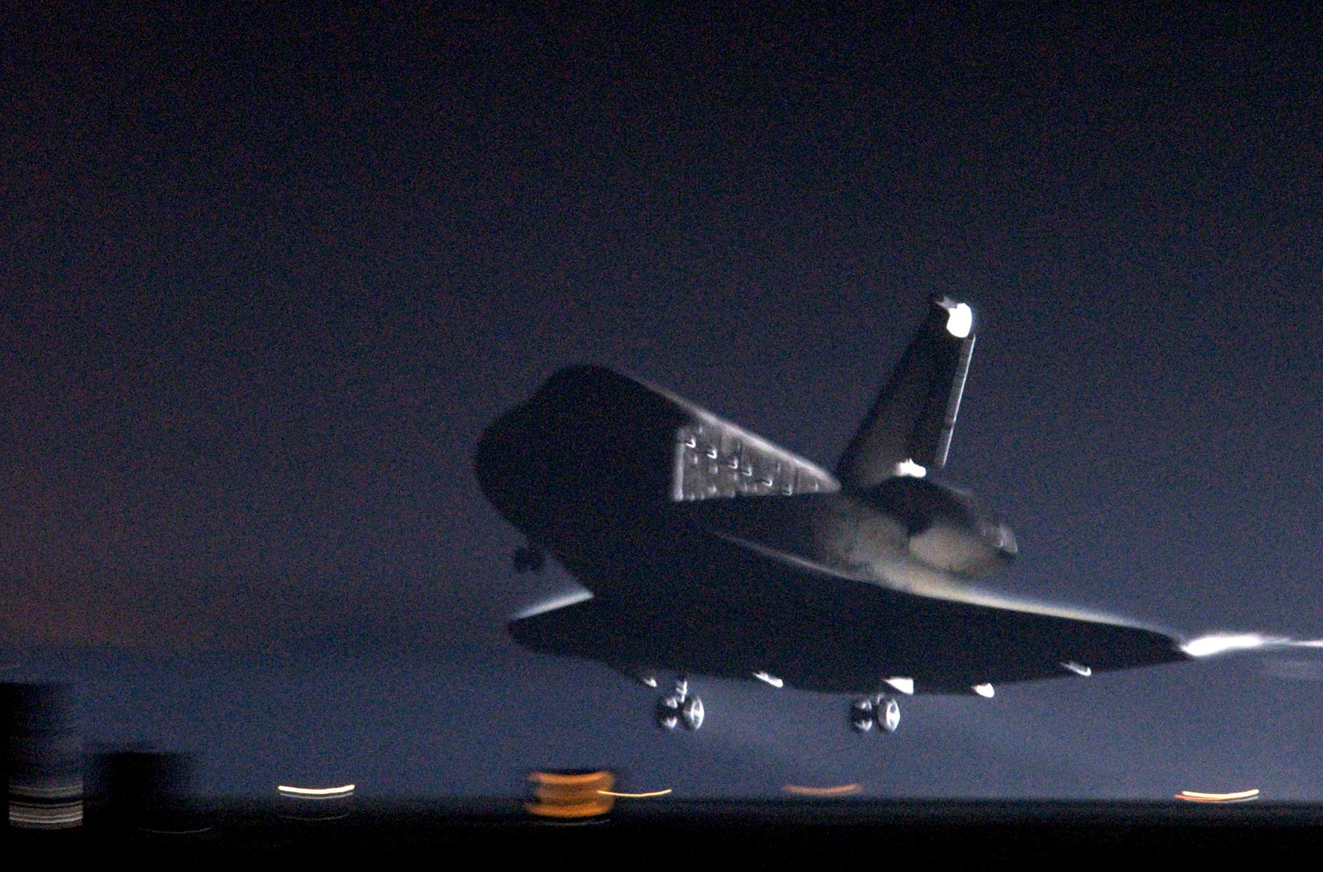 STS109-S-016 (12 March 2002)--- The Space Shuttle Columbia, with its crew of seven astronauts on board, approaches touchdown on Runway 33 of the KSC Shuttle Landing Facility, completing mission STS-109 to service the Hubble Space Telescope. Wheel stop occurred on orbit 165 at 4:33:09 a.m. EST with mission elapsed time of 10 days, 22 hours, 11 minutes. Main gear touchdown occurred at 4:31:52 a.m. and nose wheel touchdown an 4:32:02. It was the 58th landing at KSC out of 108 missions in the history of the Shuttle program.