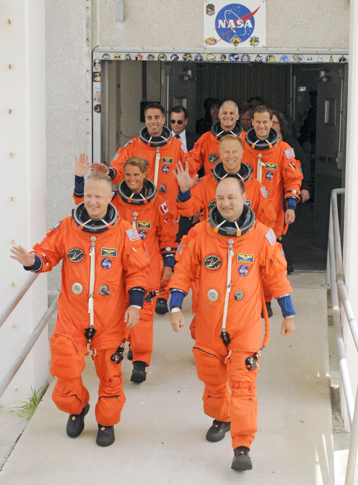 STS127-S-005 (15 July 2009) --- After suiting up, the STS-127 crew members exit the Operations and Checkout Building to board the Astrovan, which will take them to launch pad 39A for the launch of Space Shuttle Endeavour on the STS-127 mission. On the right (front to back) are astronauts Mark Polansky, commander; Tim Kopra, Tom Marshburn, and Dave Wolf, all mission specialists. On the left (front to back) are astronauts Doug Hurley, pilot; Canadian Space Agency?s Julie Payette and Christopher Cassidy, both mission specialists. Kopra will join Expedition 20 in progress to serve as a flight engineer aboard the International Space Station. The mission will feature five spacewalks and the delivery of the Japanese Experiment Module's Exposed Facility and the Experiment Logistics Module-Exposed Section in the final of three flights dedicated to the assembly of the Japan Aerospace Exploration Agency's Kibo laboratory complex on the space station.