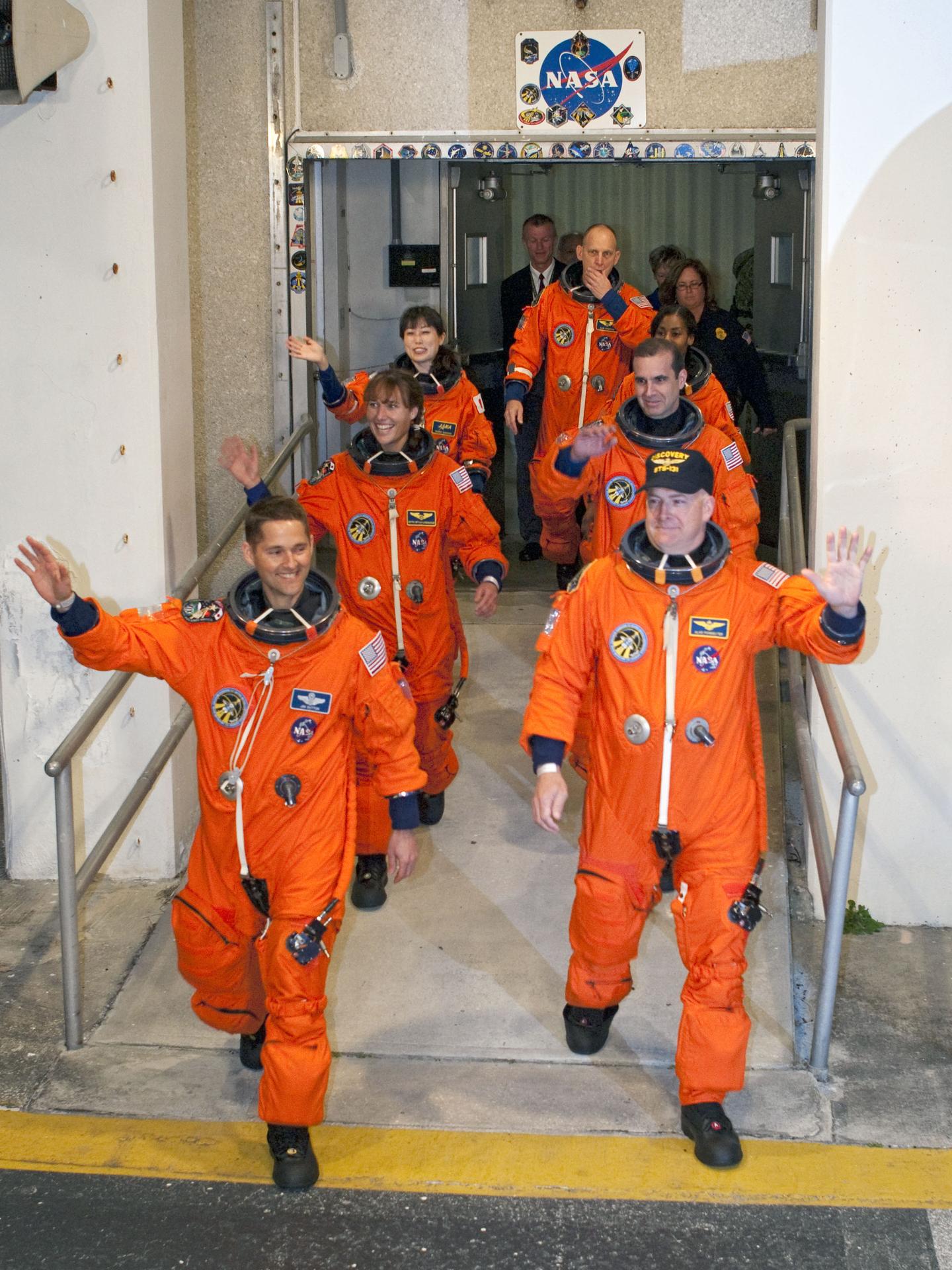STS131-S-005 (5 April 2010) --- After suiting up, the STS-131 crew members exit the Operations and Checkout Building to board the Astrovan, which will take them to launch pad 39A for the launch of space shuttle Discovery on the STS-131 mission. On the right (front to back) are NASA astronauts Alan Poindexter, commander; Rick Mastracchio, Stephanie Wilson and Clayton Anderson, all mission specialists. On the left (front to back) are NASA astronauts James P. Dutton Jr., pilot; Dorothy Metcalf-Lindenburger, and Japan Aerospace Exploration Agency (JAXA) astronaut Naoko Yamazaki, both mission specialists. Liftoff of the STS-131 mission is set for 6:21 a.m. (EDT) on April 5. On STS-131, the seven-member crew will deliver the multi-purpose logistics module Leonardo, filled with supplies, a new crew sleeping quarters and science racks that will be transferred to the International Space Station's laboratories. The crew also will switch out a gyroscope on the station’s truss structure, install a spare ammonia storage tank and retrieve a Japanese experiment from the station’s exterior. STS-131 is the 33rd shuttle mission to the station and the 131st shuttle mission overall.
