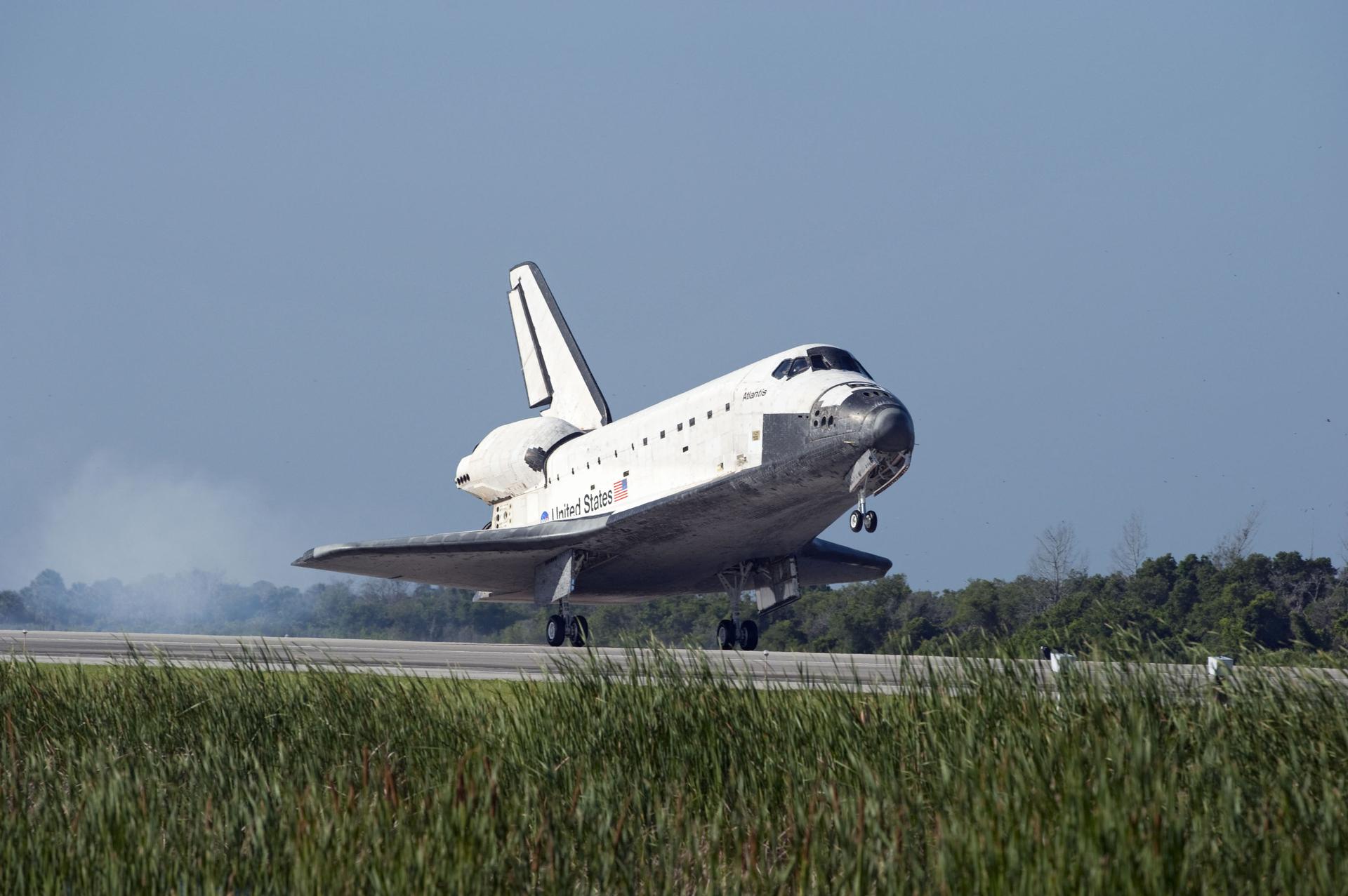 STS132-S-113 (26 May 2010) --- Space shuttle Atlantis' main gear touches down on Runway 33 at the Shuttle Landing Facility at NASA's Kennedy Space Center in Florida. Landing was at 8:48 a.m. (EDT) on May 26, 2010, completing the 12-day STS-132 mission to the International Space Station. Main gear touchdown was at 8:48:11 a.m., followed by nose gear touchdown at 8:48:21 a.m. and wheelstop at 8:49:18 a.m. Onboard are NASA astronauts Ken Ham, commander; Tony Antonelli, pilot; Garrett Reisman, Michael Good, Steve Bowen and Piers Sellers, all mission specialists. The six-member STS-132 crew carried the Russian-built Mini Research Module 1 (MRM1) to the orbital complex. STS-132 is the 34th shuttle mission to the station, the 132nd shuttle mission overall and the last planned flight for Atlantis.
