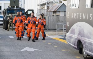 NASA astronauts Victor Glover, pilot, front left; Reid Wiseman, commander, front right; Christina Koch, mission specialist, back right; and CSA (Canadian Space Agency) astronaut Jeremy Hansen, mission specialist, back left, are seen as they depart the Neil A. Armstrong Operations and Checkout Building to board their Orion spacecraft atop NASA’s Space Launch System rocket inside the Vehicle Assembly Building as part of the Artemis II countdown demonstration test, Saturday, Dec. 20, 2025, at NASA’s Kennedy Space Center in Florida. For this operation, the Artemis II crew and launch teams are simulating the launch day timeline including suit-up, walkout, and spacecraft ingress and egress. Through the Artemis campaign, NASA will send astronauts to explore the Moon for scientific discovery, economic benefits, and to build the foundation for the first crewed missions to Mars, for the benefit of all.