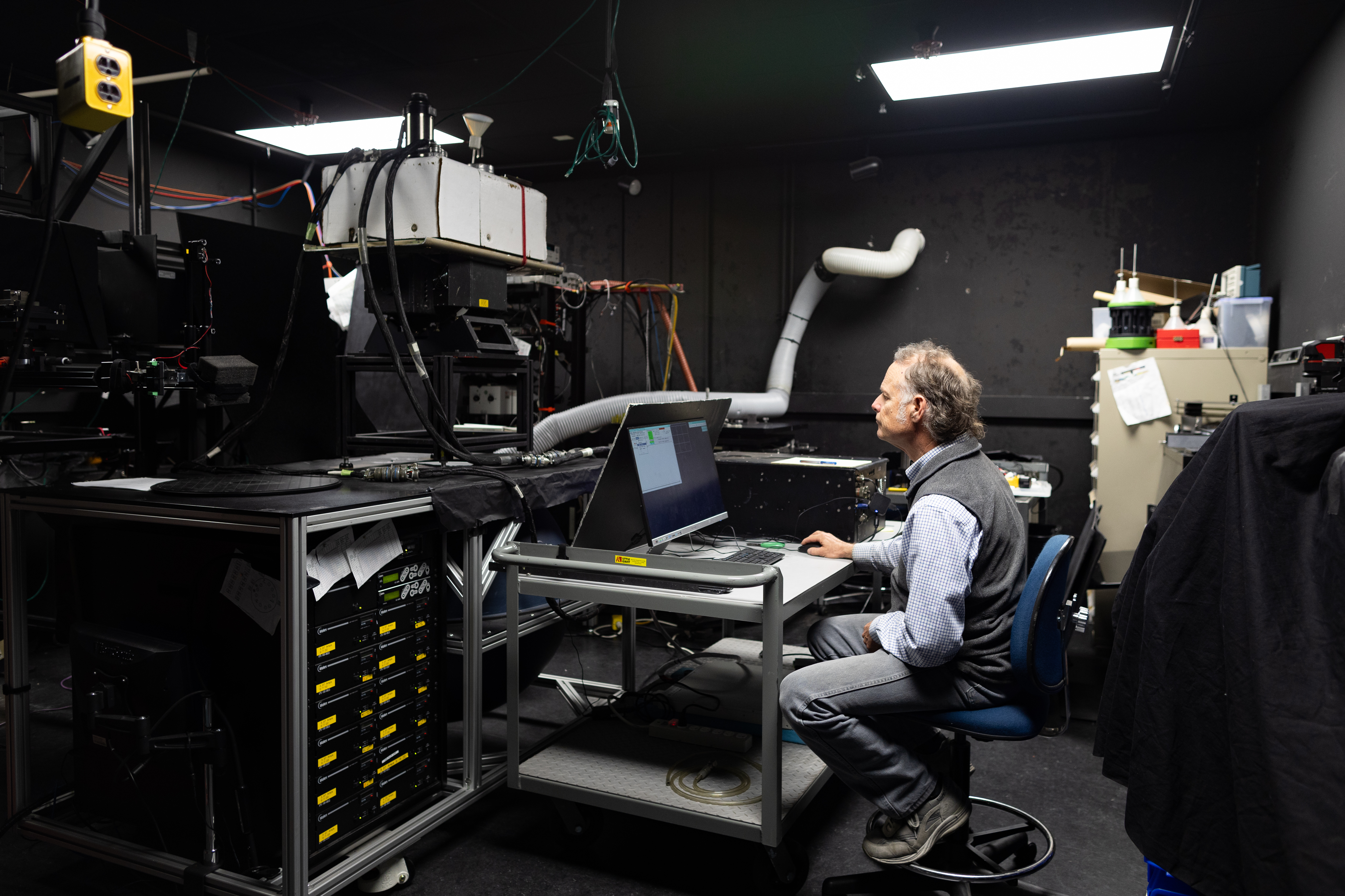 Senior Engineer Ted Hildum checks data during calibration tests on the MODIS/ASTER Airborne Simulator (MASTER) spectrometer, co-developed by NASA’s Ames Research Center and NASA’s Jet Propulsion Laboratory. Hildum works at the Airborne Sensor Facility at Ames, which builds, maintains, miniaturizes, and calibrates instruments.