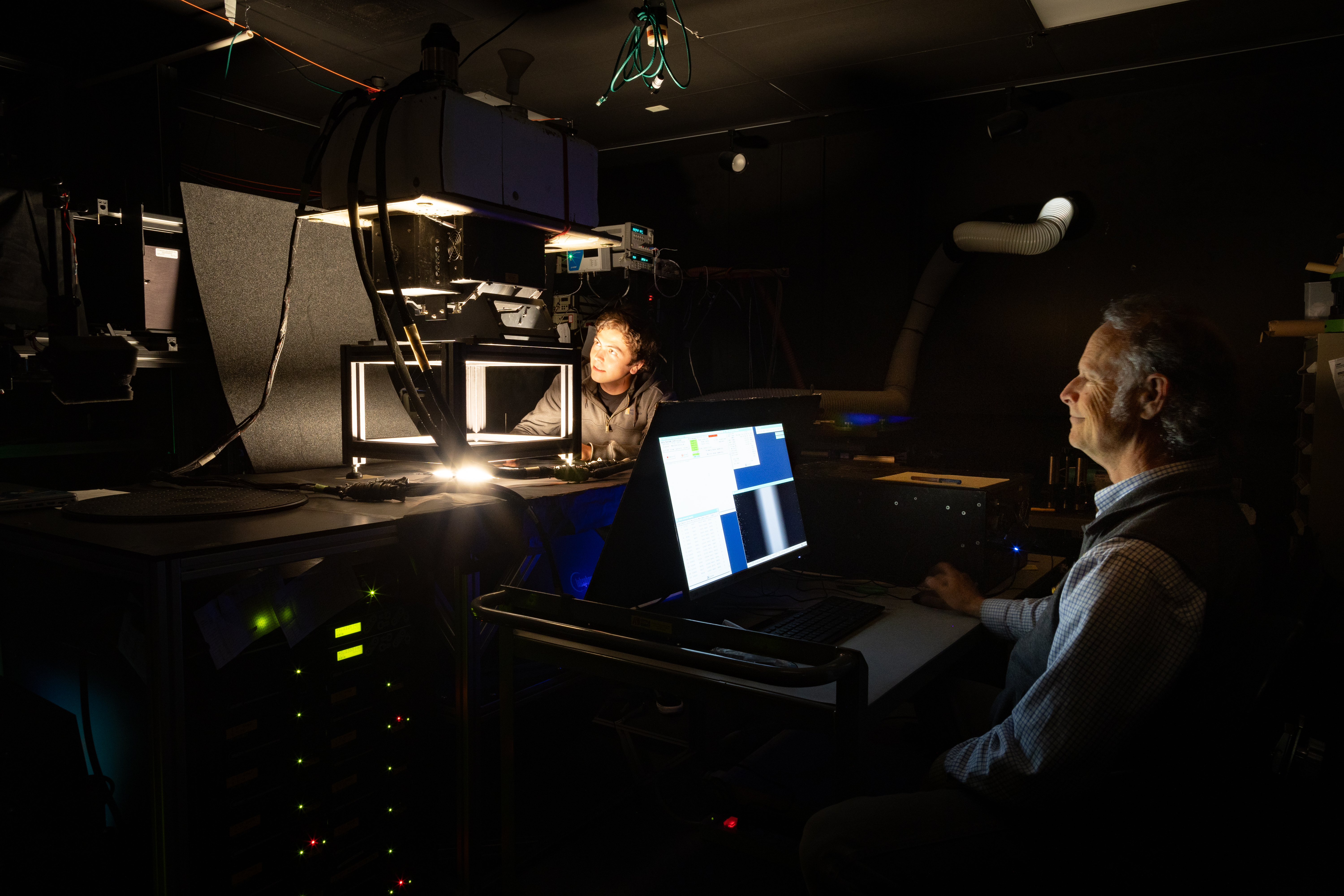 Senior Engineer Ted Hildum (right) and Nikolas Gibson (left) run calibration tests on the MODIS/ASTER Airborne Simulator (MASTER) spectrometer, co-developed by NASA’s Ames Research Center and NASA’s Jet Propulsion Laboratory. Hildum works at the Airborne Sensor Facility at Ames, which builds, maintains, miniaturizes, and calibrates instruments.