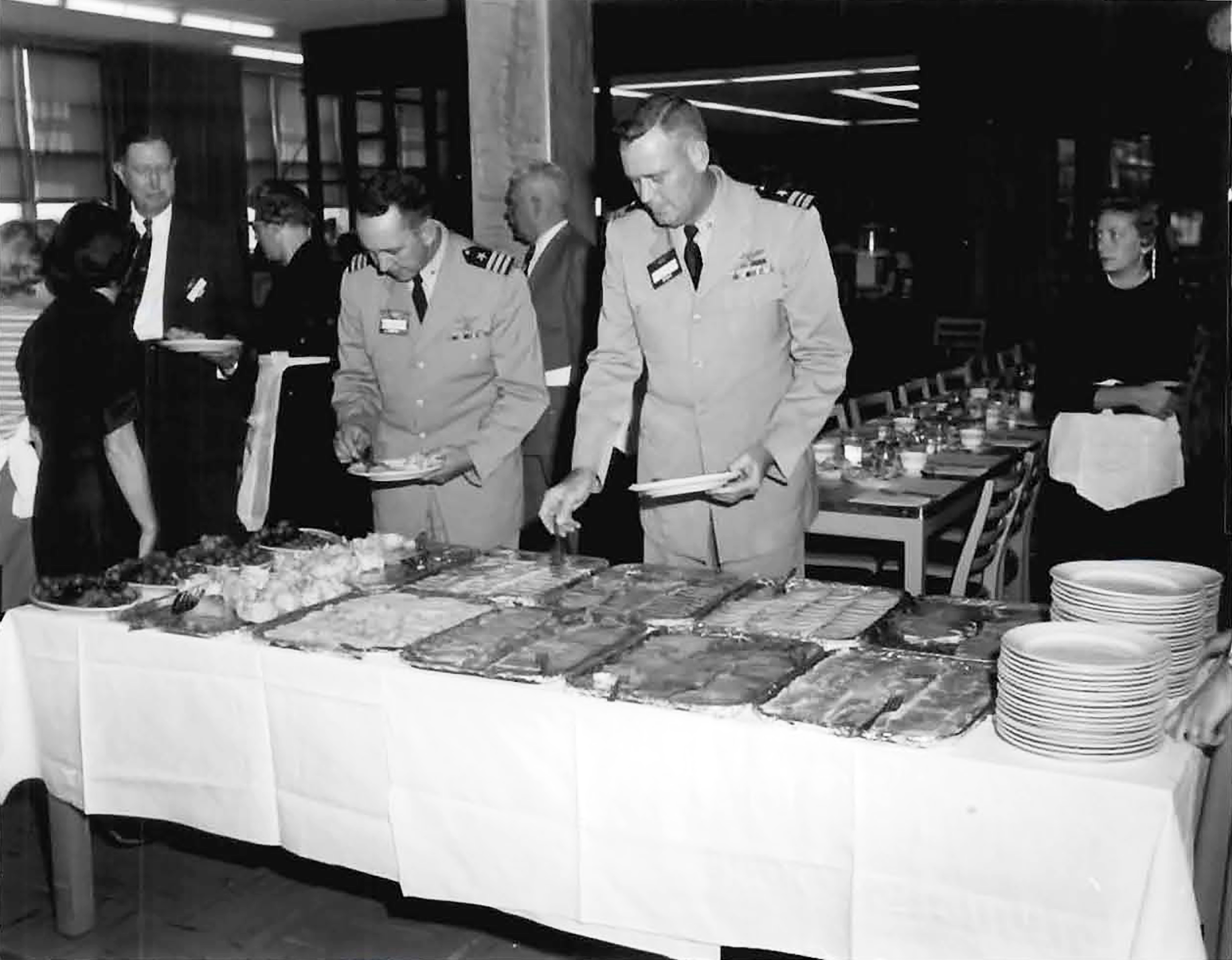 Military personnel at lunch during the 1957 Lewis Inspection.