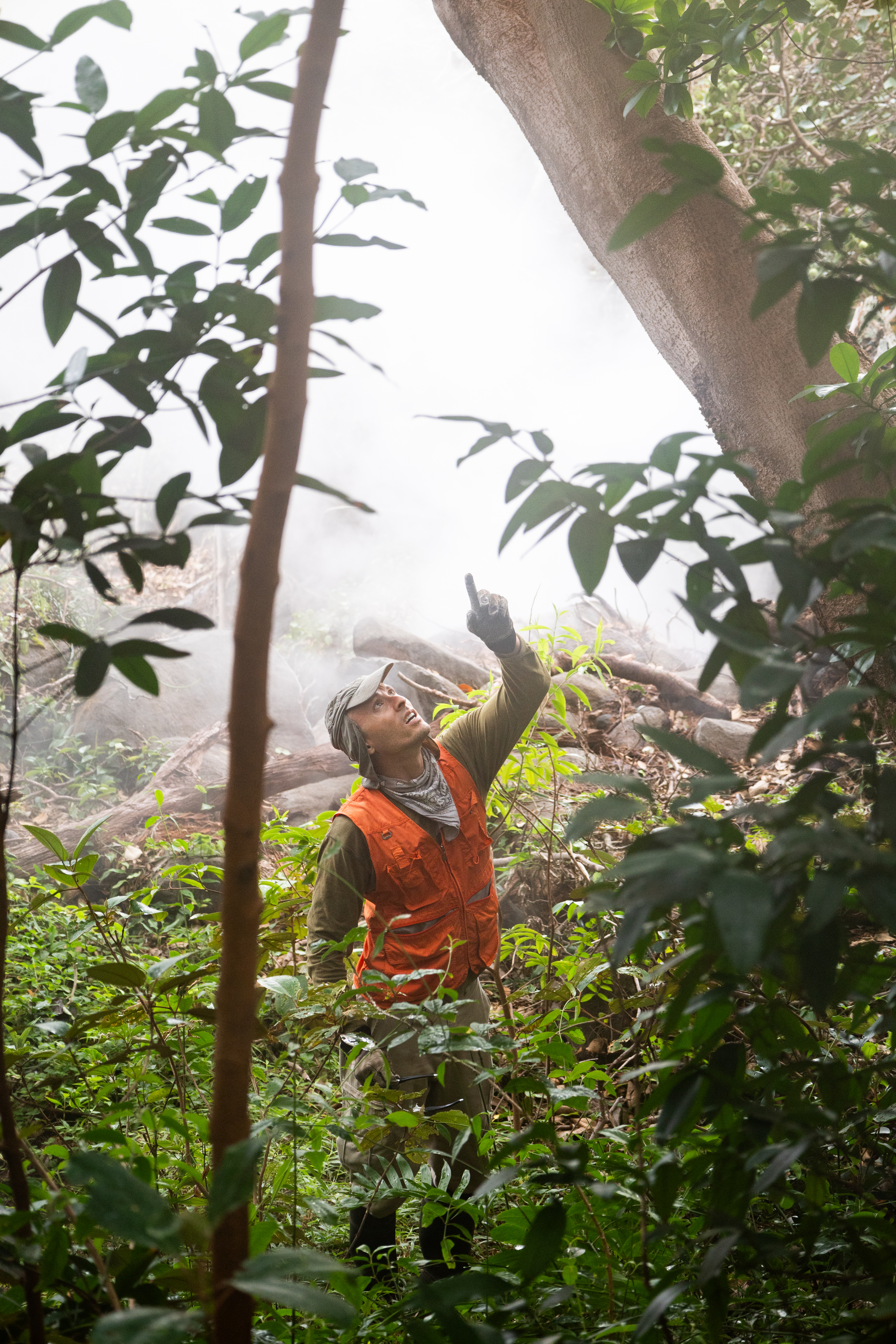 A man in an olive green long sleeve, bright orange vest, and gray hat and neck scarf points up into the trees above him. Around him are green leafy trees, while clouds of white haze drift in the background.