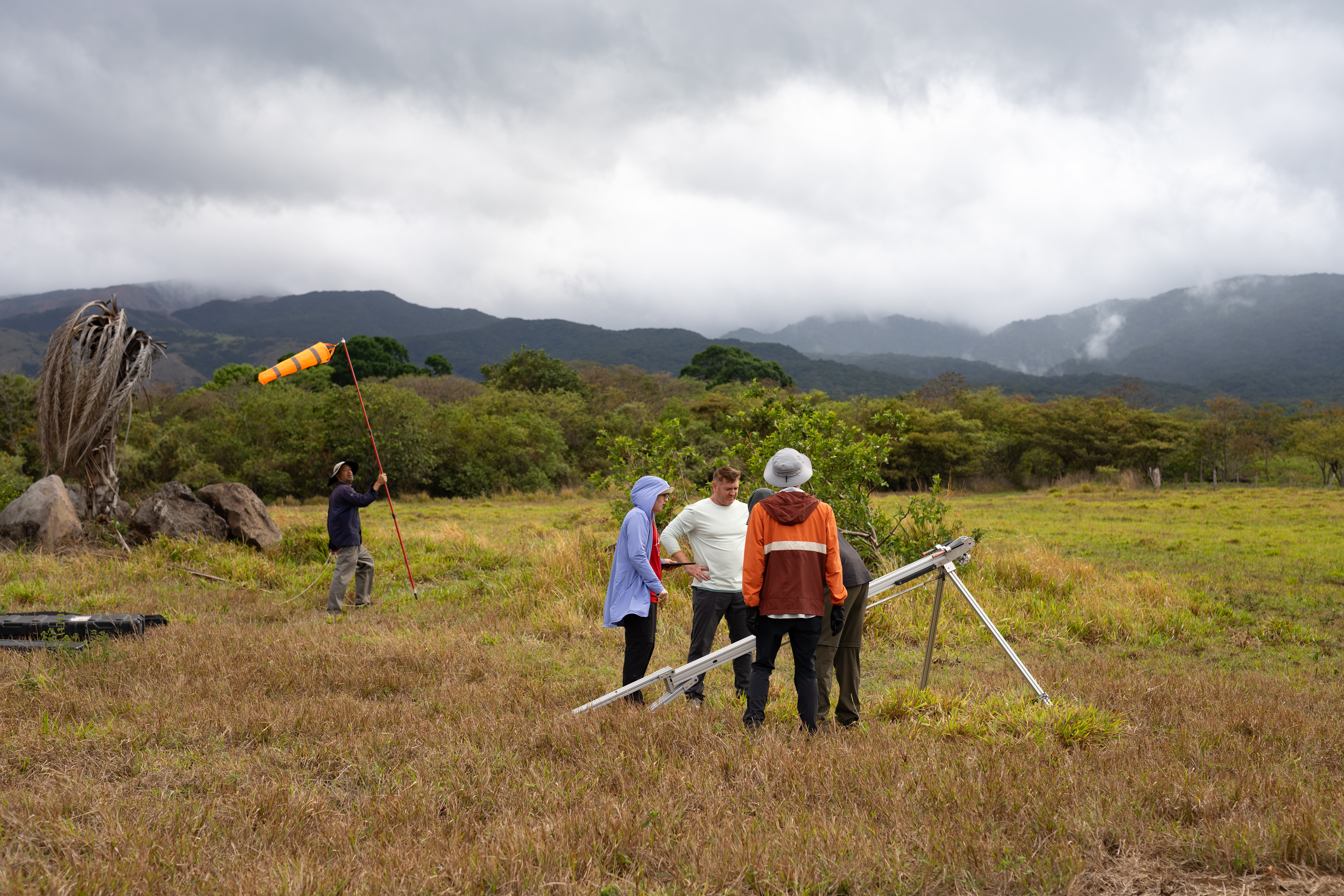 Members of the CRATER team wait by the launcher for the S2 Black Swift uncrewed aircraft system (UAS) to return from a flight during the field campaign in Rincon de la Vieja National Park, Costa Rica. CRATER (Costa Rica Airborne research on foresT Ecosystem Response to volcanic emissions), is a NASA-led project investigating the use of an uncrewed aircraft for volcanic trace gas sampling, in order to better understand the impact of carbon dioxide emissions on vegetation.