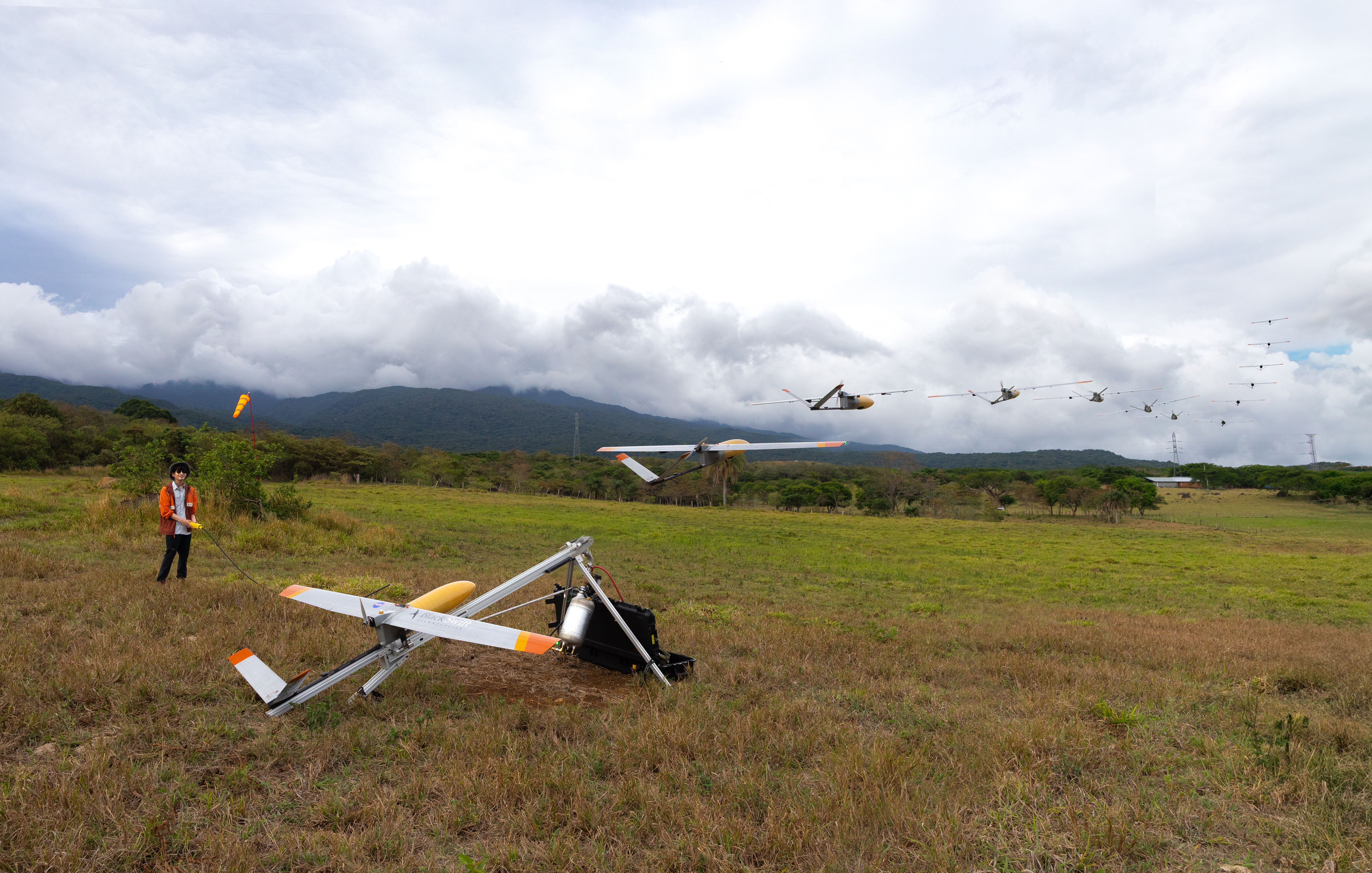 In this composite image, CRATER science principal investigator Jay Tomlin launches the S2 Black Swift uncrewed aircraft system (UAS) into the sky at Rincon de la Vieja National Park, Costa Rica, during the 2025 campaign. CRATER (Costa Rica Airborne research on foresT Ecosystem Response to volcanic emissions), is a NASA-led project investigating the use of an uncrewed aircraft for volcanic trace gas sampling, in order to better understand the impact of elevated carbon dioxide emissions on vegetation.