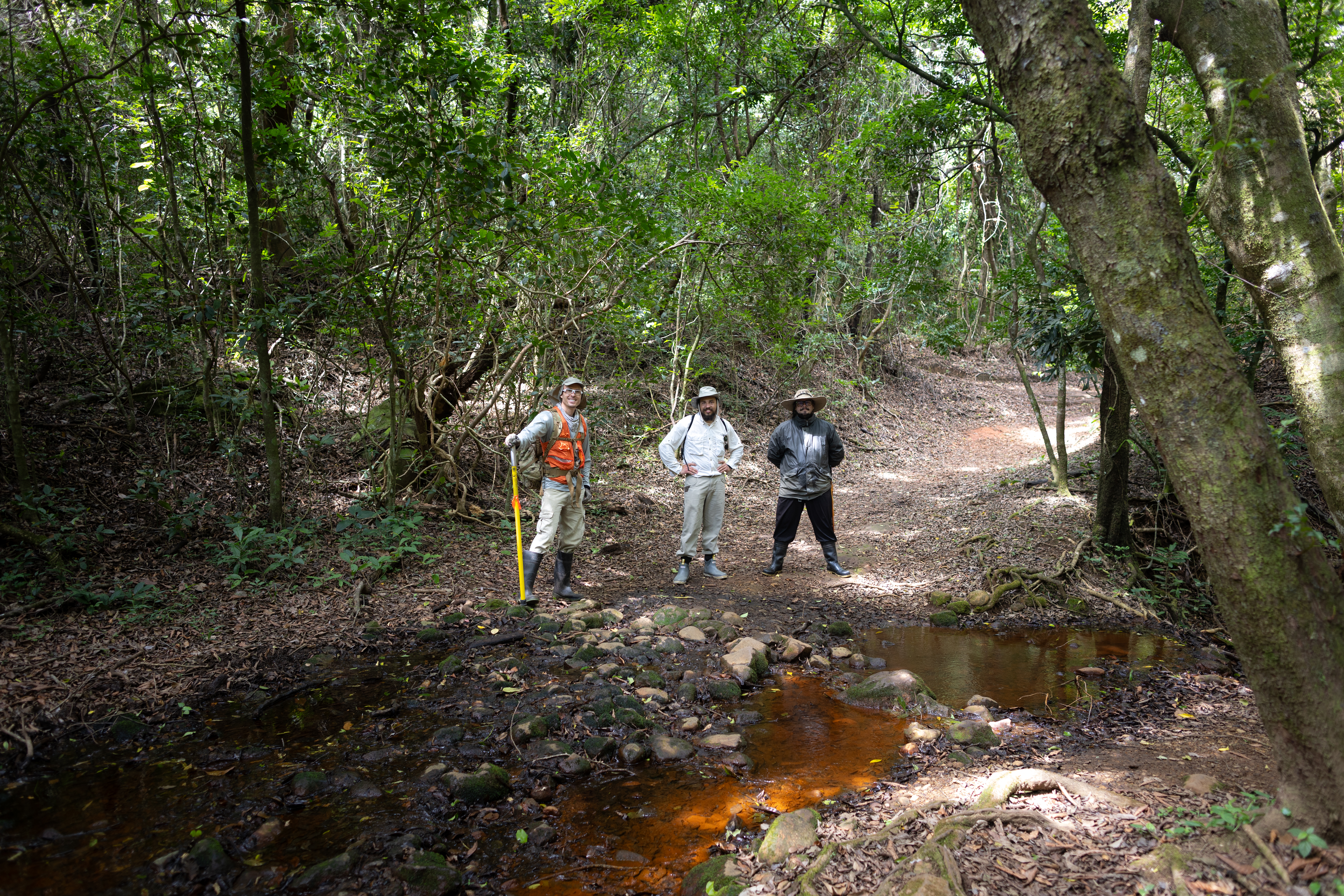 CRATER team members (from left) Joshua Fisher, Isaac Anderson and Ernesto Corrales hike through Rincon de la Vieja National Park, Costa Rica, to gather data from trace gas sensors. Fisher and his team placed sensors at locations across the forest to measure emissions, in an effort to understand how vegetation responds to elevated levels of carbon dioxide.