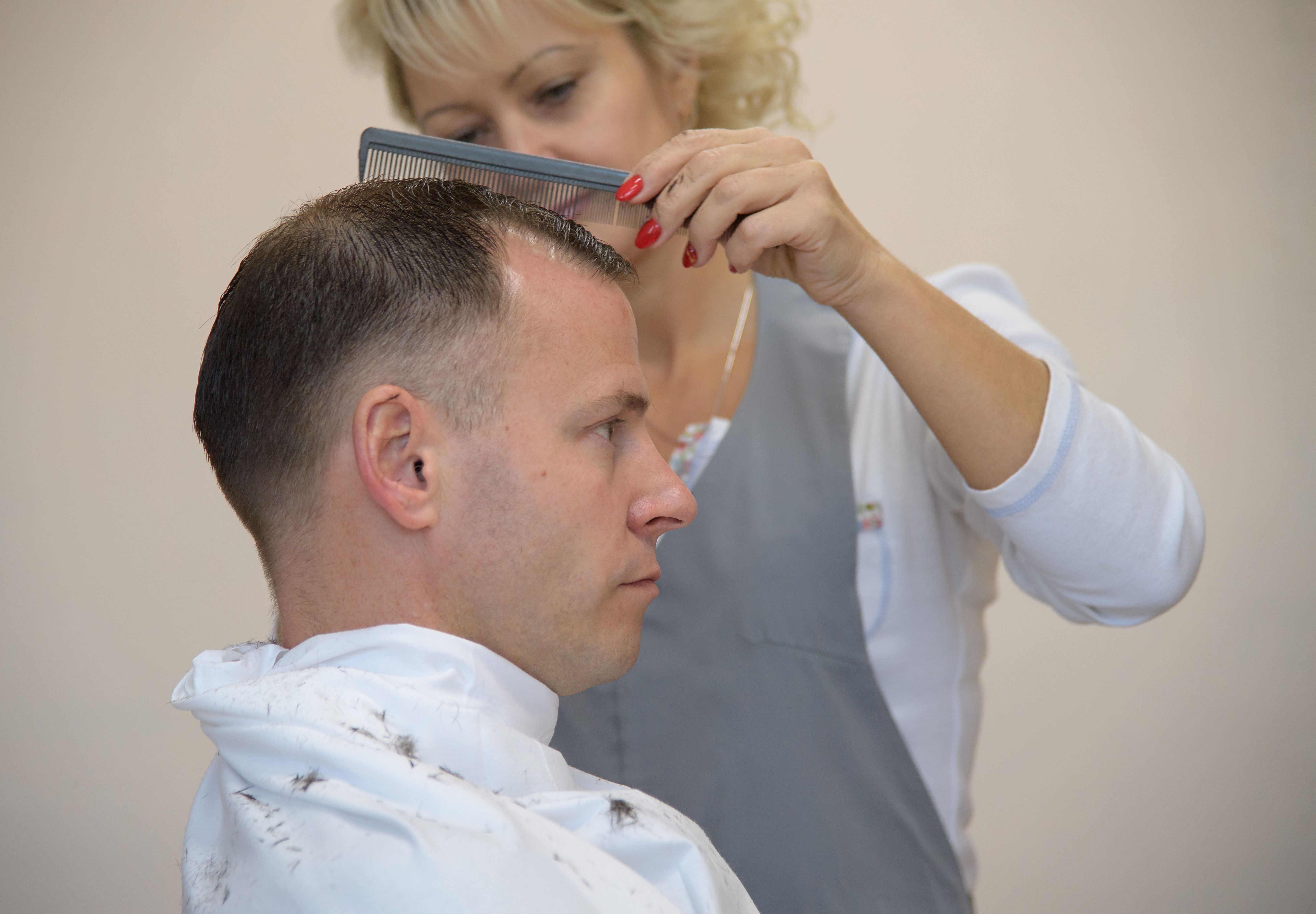 Expedition 57 Flight Engineer Nick Hague of NASA gets his hair cut