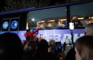 NASA astronaut Jonny Kim, left, and Roscosmos cosmonaut Alexey Zubritskiy interact with family and friends as they prepare depart the Cosmonaut Hotel along with Roscosmos cosmonaut Sergey Ryzhikov to suit-up for their Soyuz launch to the International Space Station, Tuesday, April 8, 2025 (April 7 Eastern Time), in Baikonur, Kazakhstan. The launch will send Kim, Ryzhikov, Zubritskiy on a mission to the International Space Station.