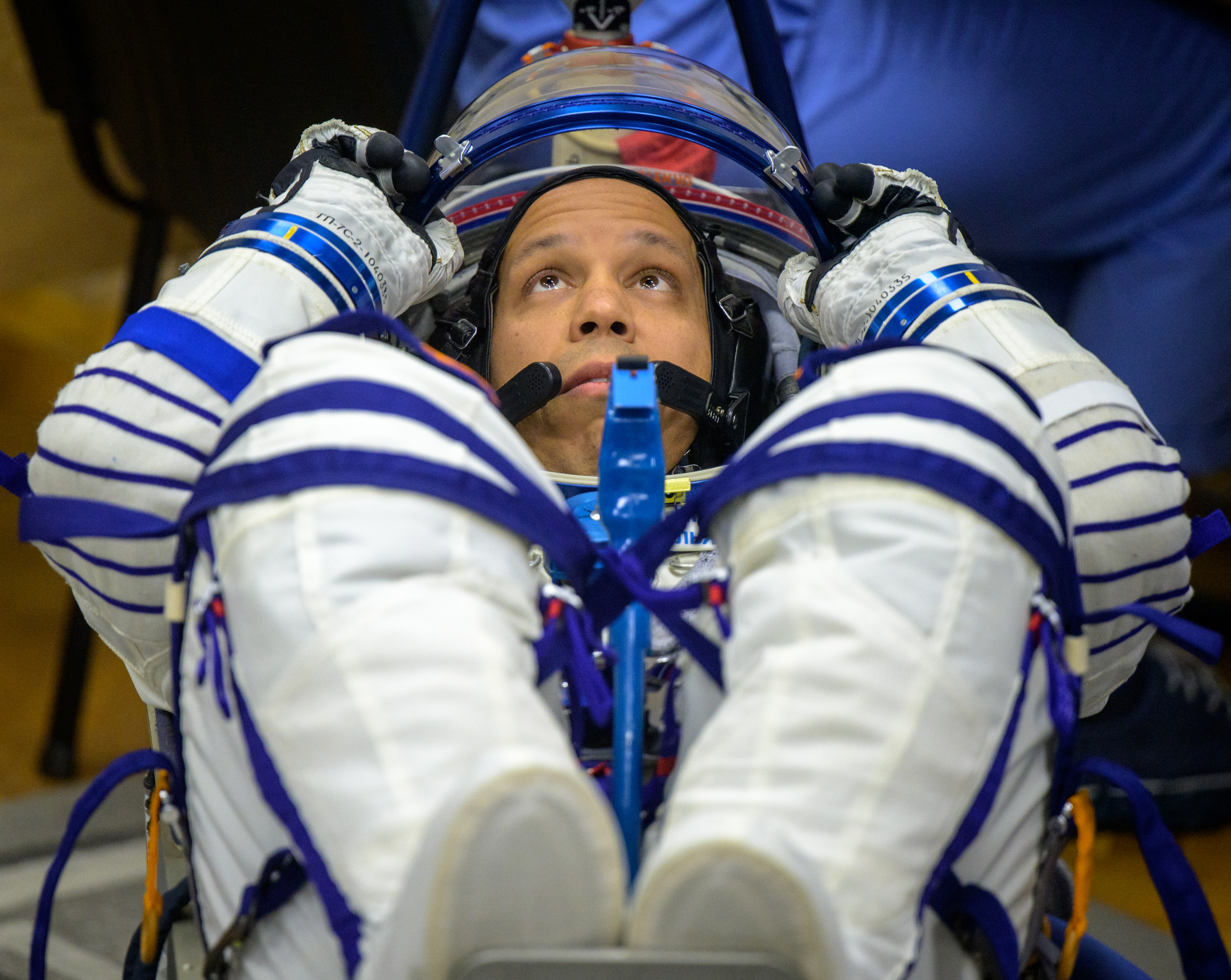 NASA astronaut Chris Williams has his Russian Sokol suit pressure checked as he and Roscosmos cosmonauts Sergey Kud-Sverchkov, and Sergei Mikaev, prepare to launch in the Soyuz rocket to the International Space Station Thursday, Nov. 27, 2025 in Baikonur, Kazakhstan.