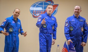 NASA astronaut Chris Williams, left, and Roscosmos cosmonauts Sergey Kud-Sverchkov, and Sergei Mikaev, right, are seen in quarantine, behind glass, at the conclusion of a press conference, Wednesday, Nov. 26, 2025 a the Cosmonaut Hotel in Baikonur, Kazakhstan. Expedition 74 crewmembers: NASA astronaut Chris Williams, Roscosmos cosmonauts Sergey Kud-Sverchkov and Sergei Mikaev, are scheduled to launch aboard their Soyuz MS-28 spacecraft on November 27.