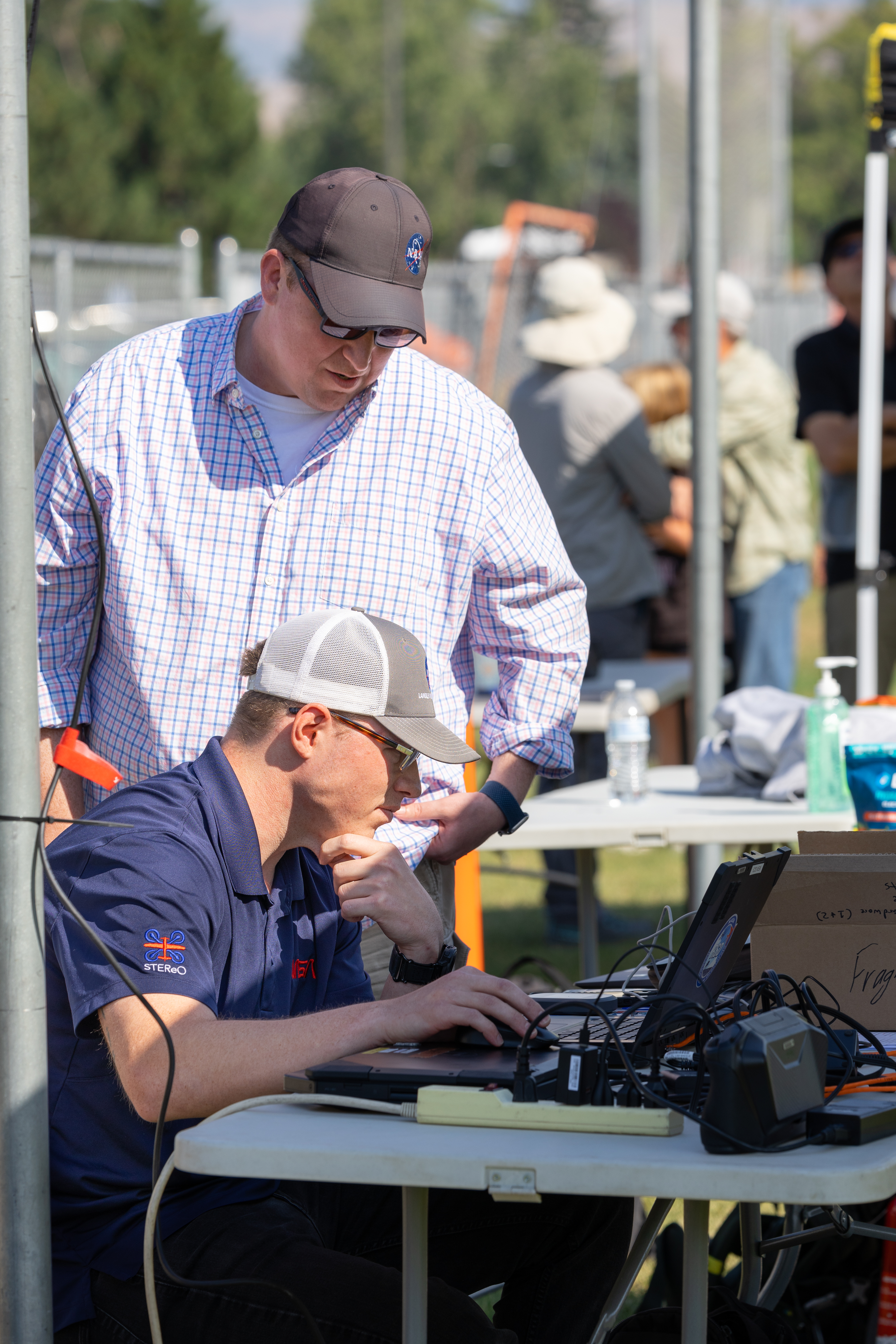 Jacob Revesz, UAS Ground Station Operator, tracks the flight progress of the Alta X quadcopter while Robert McSwain, FireSense UAS Lead at NASA Langley, looks on. This was one of eight launches the team performed during the August FireSense UAS Technology Demonstration in Missoula, Montana.