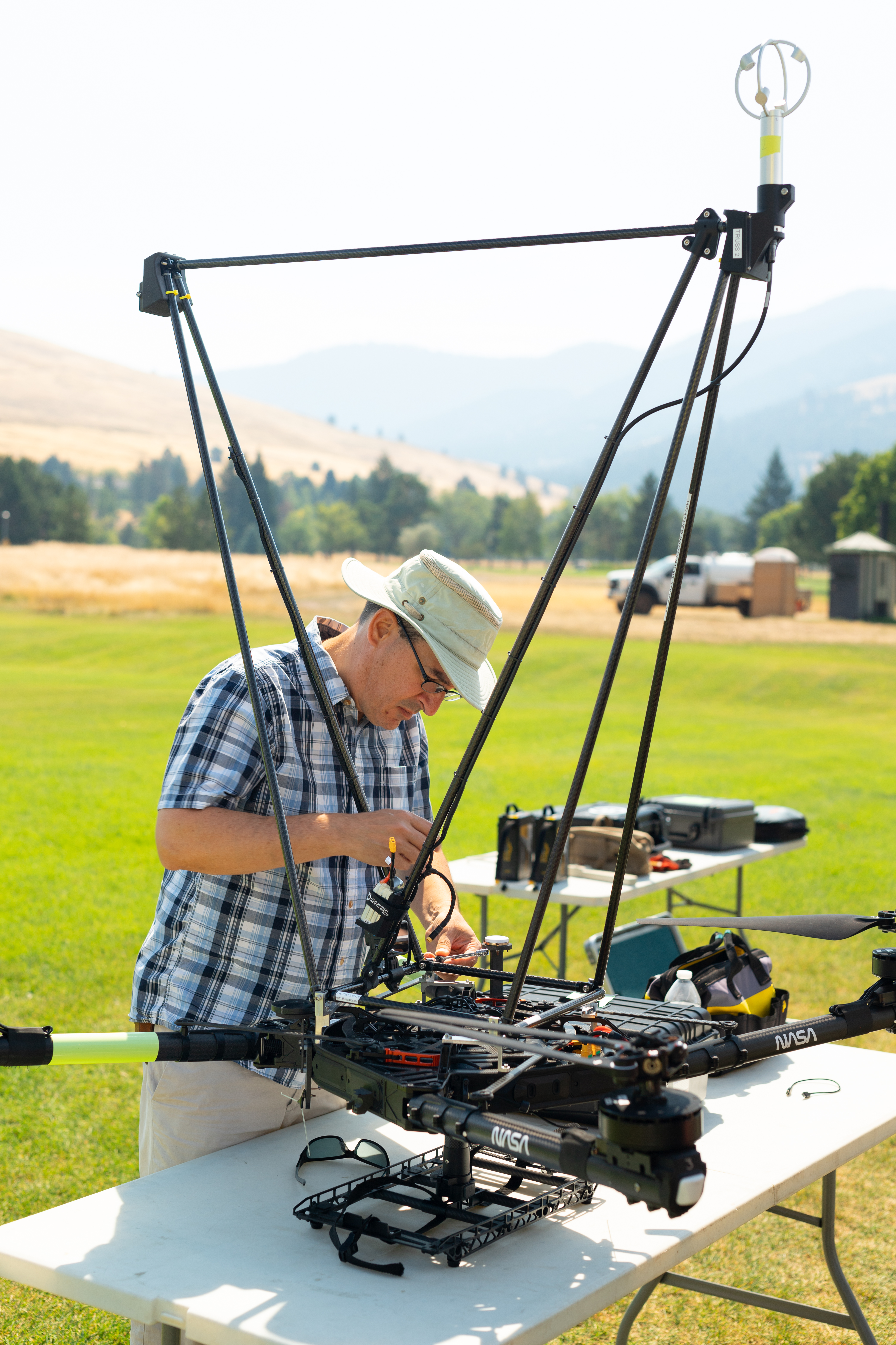 Mechanical engineer Todd Ferrante (NASA Langley) works on the NASA Alta X quadcopter between flights. Mounted on the drone is an infrastructure developed at NASA Langley to fly an anemometer (top right) and radiosonde (not pictured) in order to gather data on wind speed and direction.