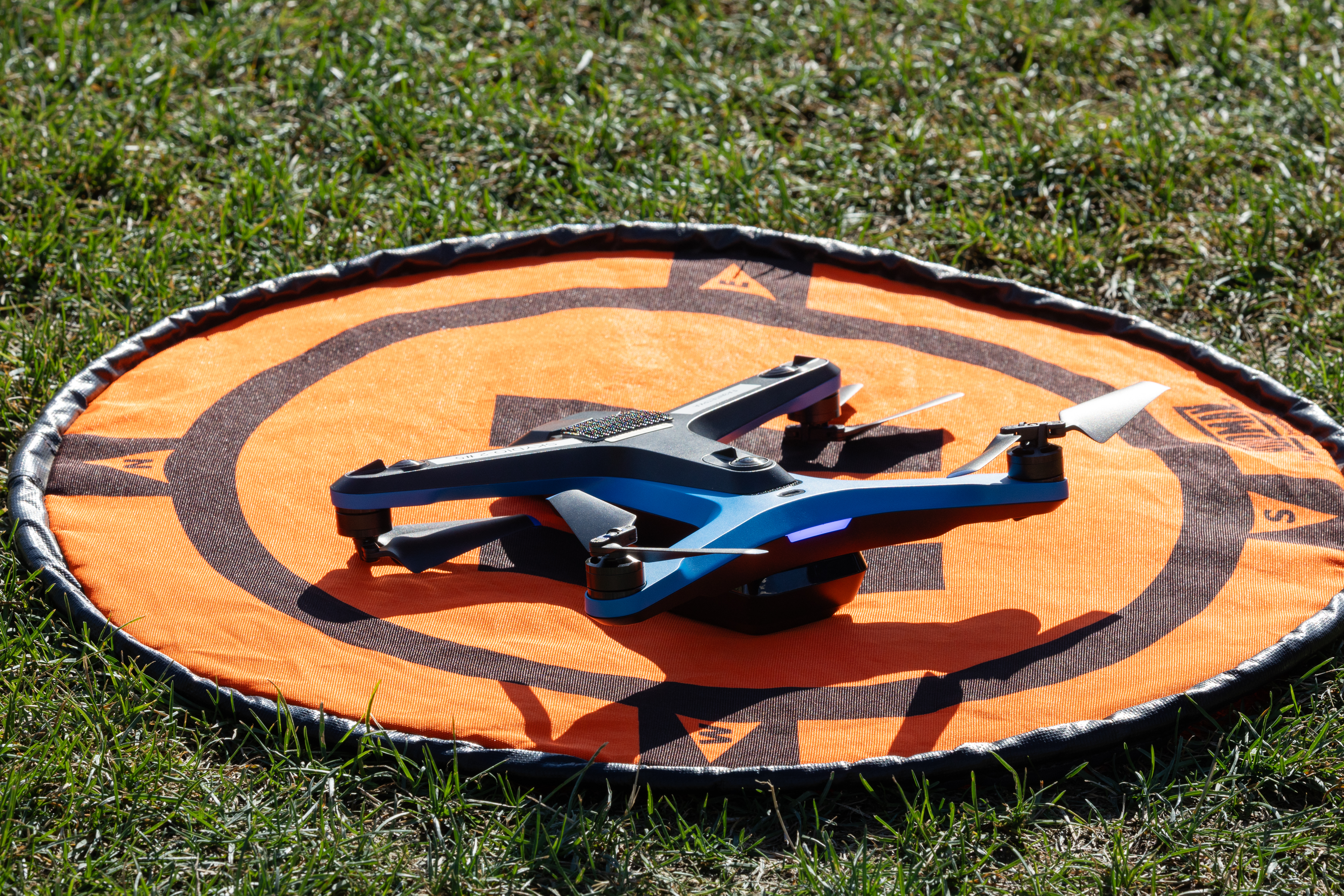 The Skydio-2 drone sits in a field just before takeoff during the FireSense uncrewed aerial system (UAS) technology demonstration in Missoula, Montana. The Skydio-2 was flown to capture images and videos of the NASA Alta X quadcopter in flight.