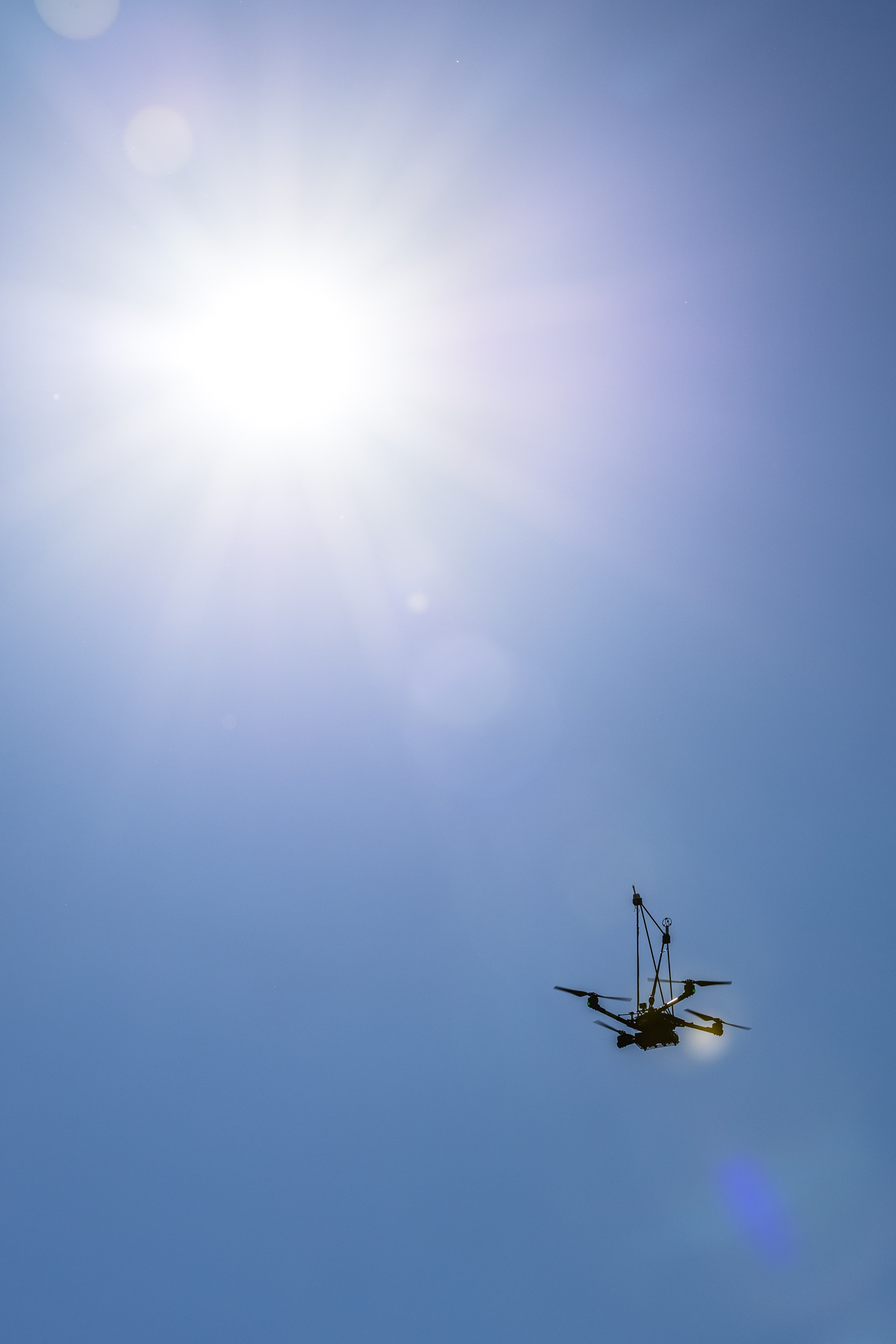 The NASA Alta X quadcopter descends from its final flight as part of the FireSense uncrewed aerial system (UAS) technology demonstration in Missoula, Montana.
