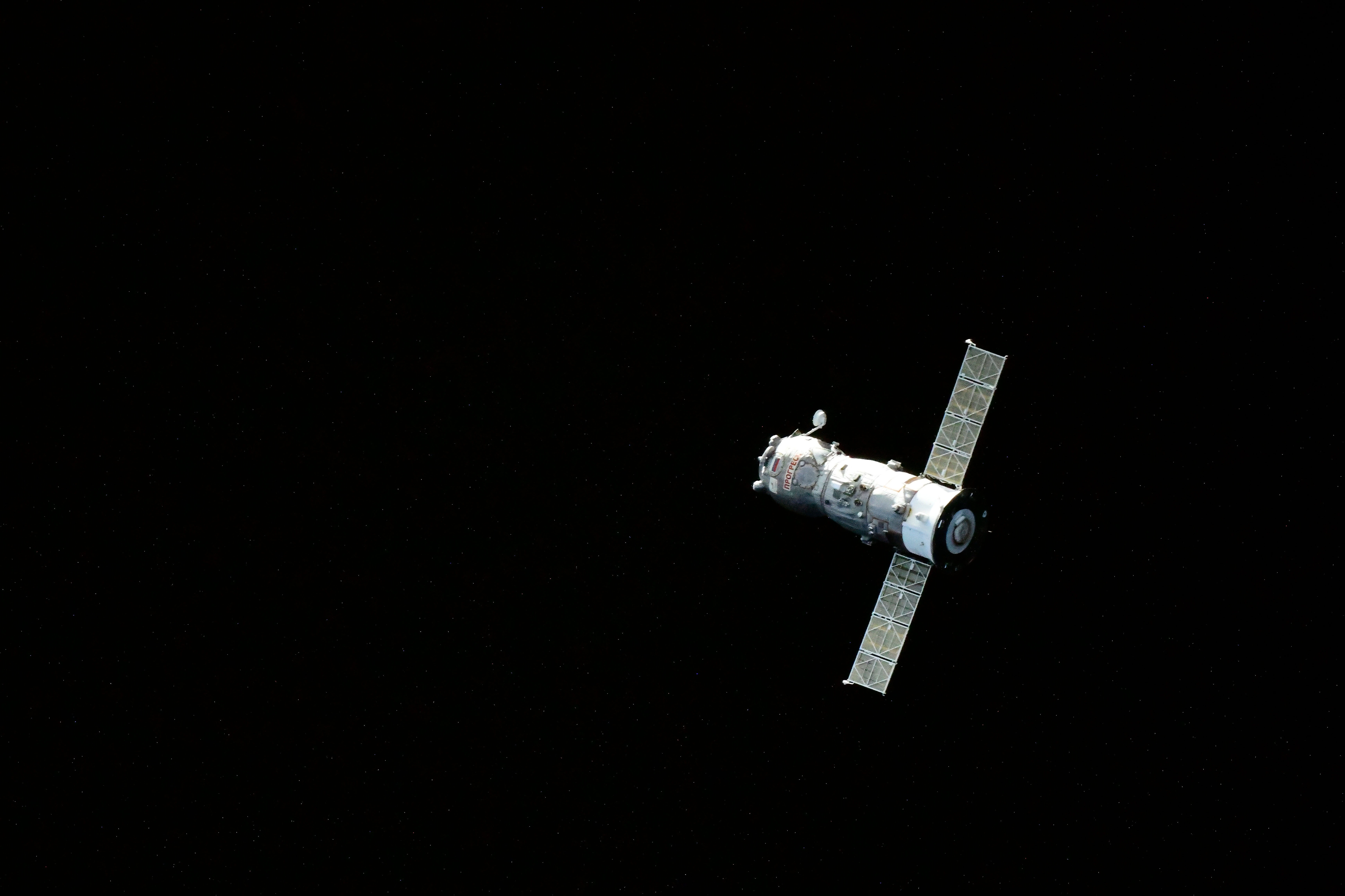 iss068e055642 (Feb. 18, 2023) --- The ISS Progress 82 cargo craft is pictured departing the vicinity of the International Space Station after undocking from the Poisk module ending a four-month resupply mission.