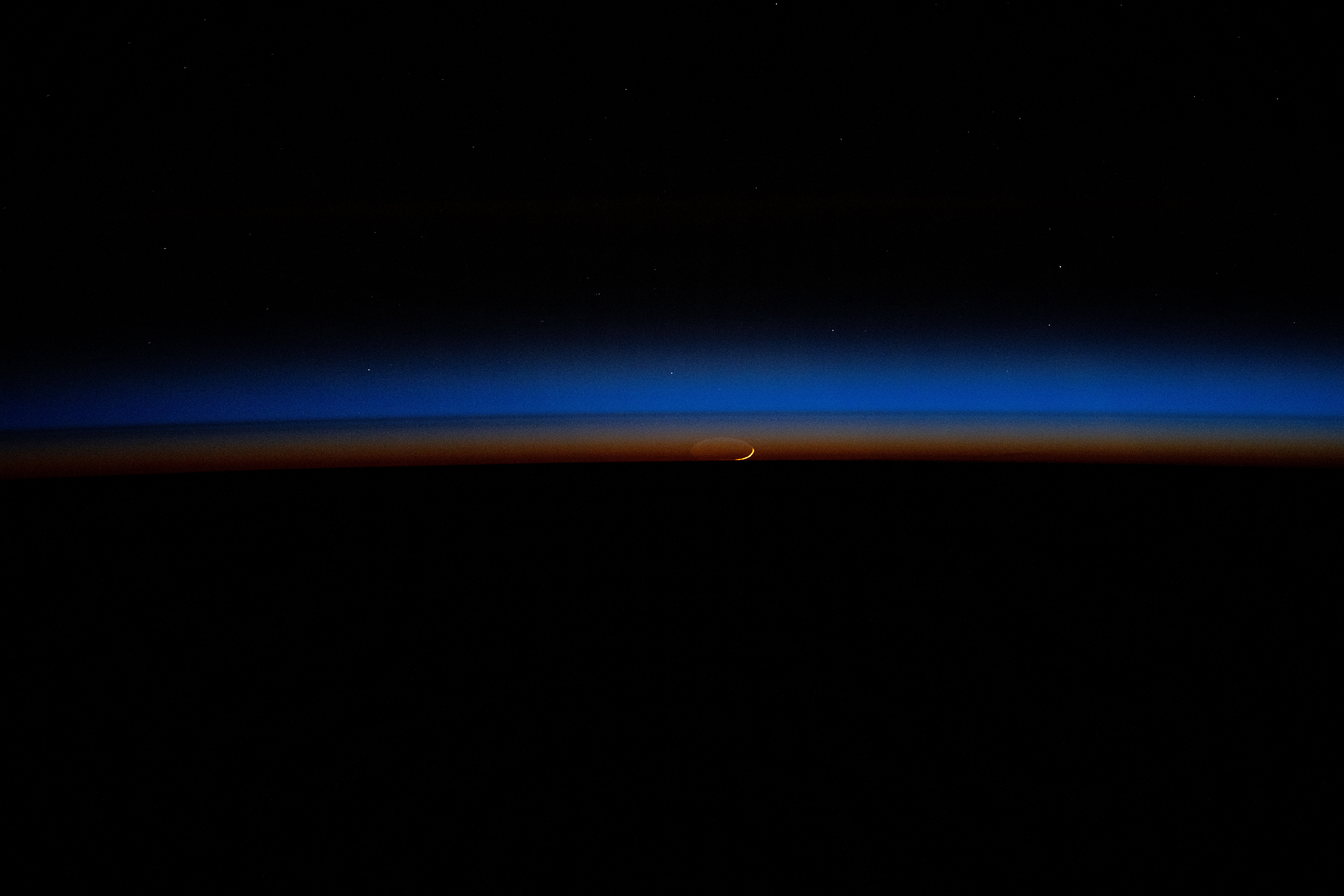 iss071e609208 (Sept. 4, 2024) -- The Moon rises through a sunset in Earth's horizon casting blue and orange hues as the International Space Station orbited 257 miles above India.