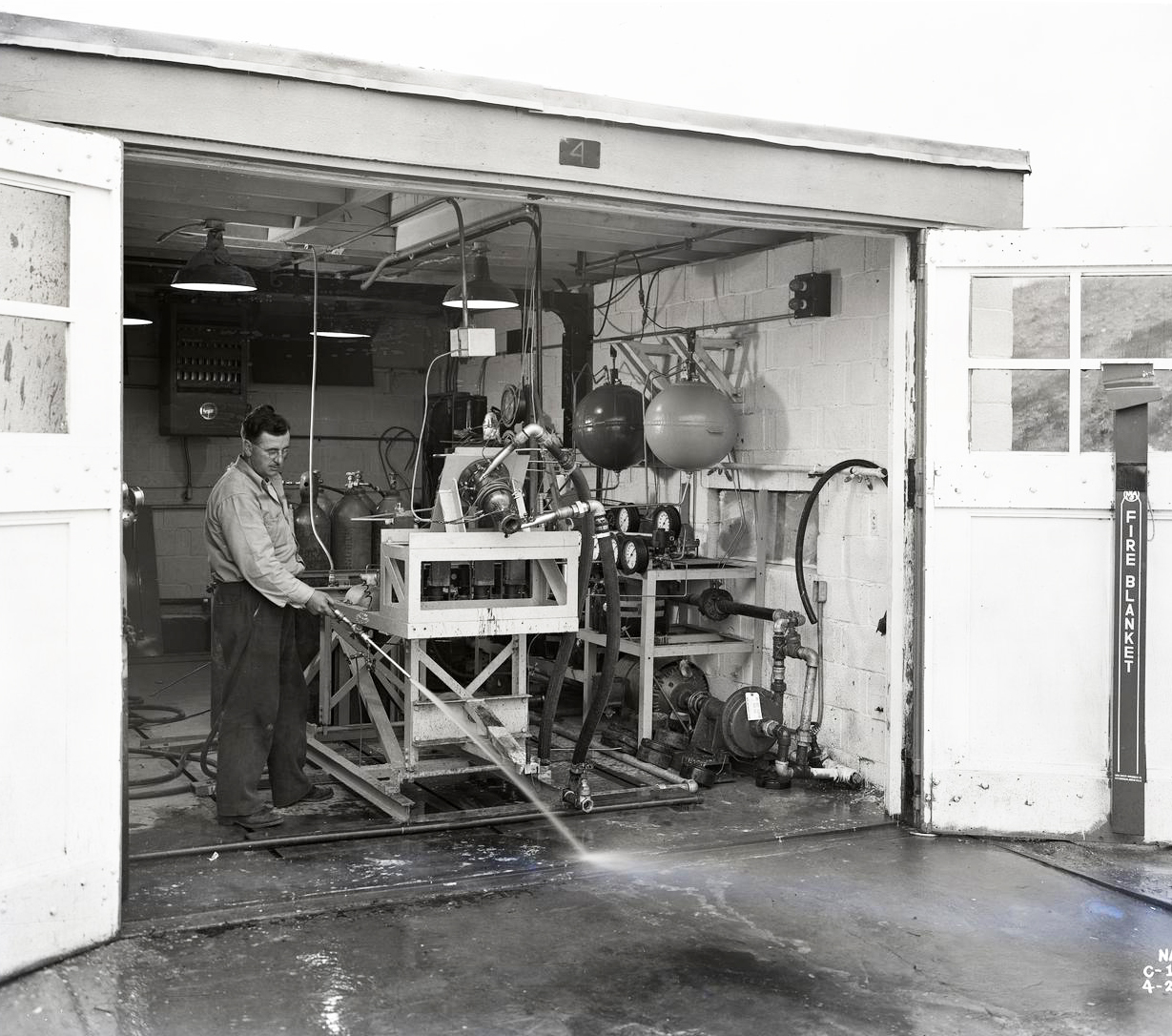 LIQUID COOLED 500 POUND THRUST ROCKET USED FOR FUEL RATING TESTS IN THE HIGH PRESSURE COMBUSTION LABORATORY CELL 4