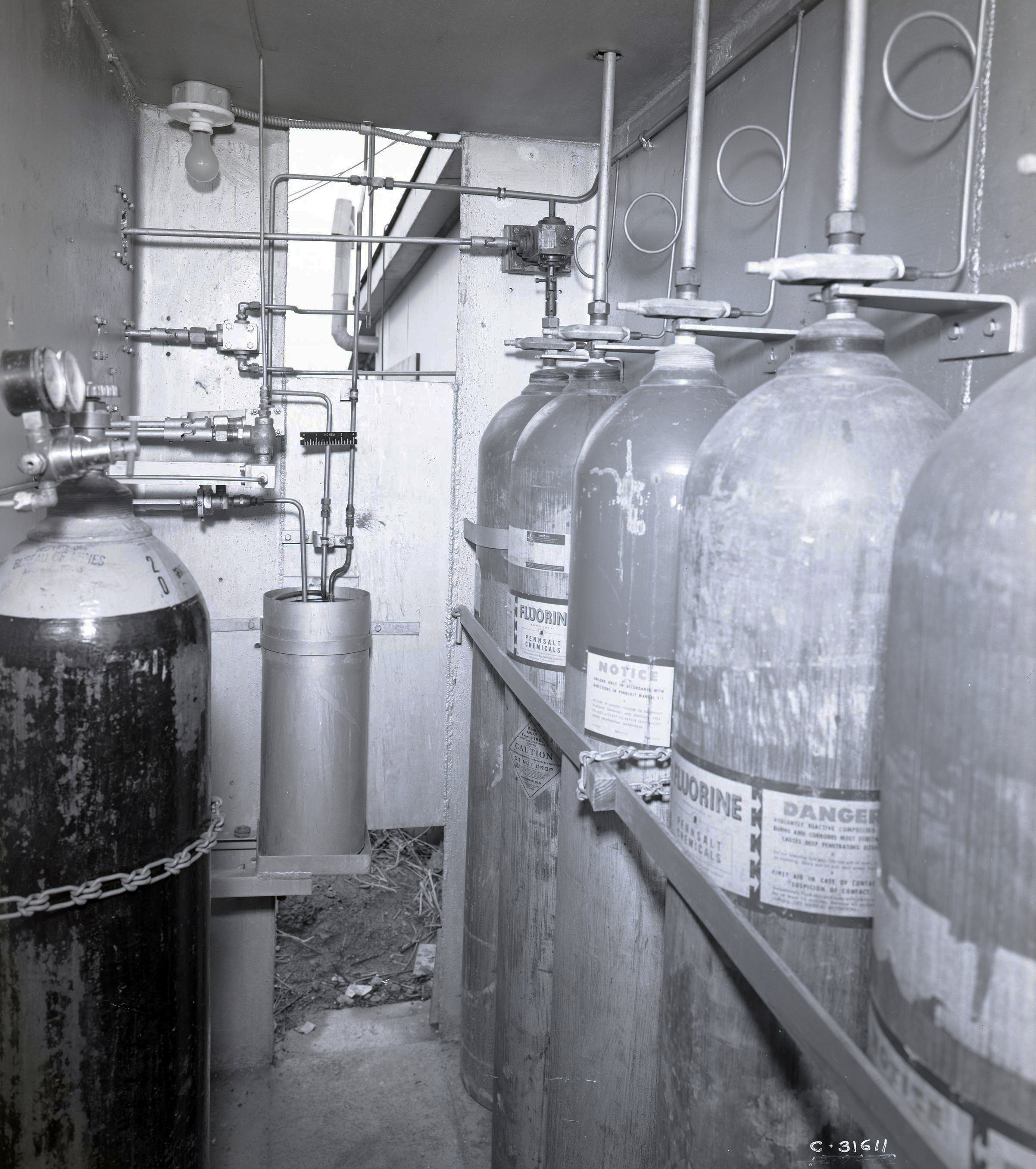 Fluorine cylinders at the Rocket Lab for engine testing in Cell 31 (1952).