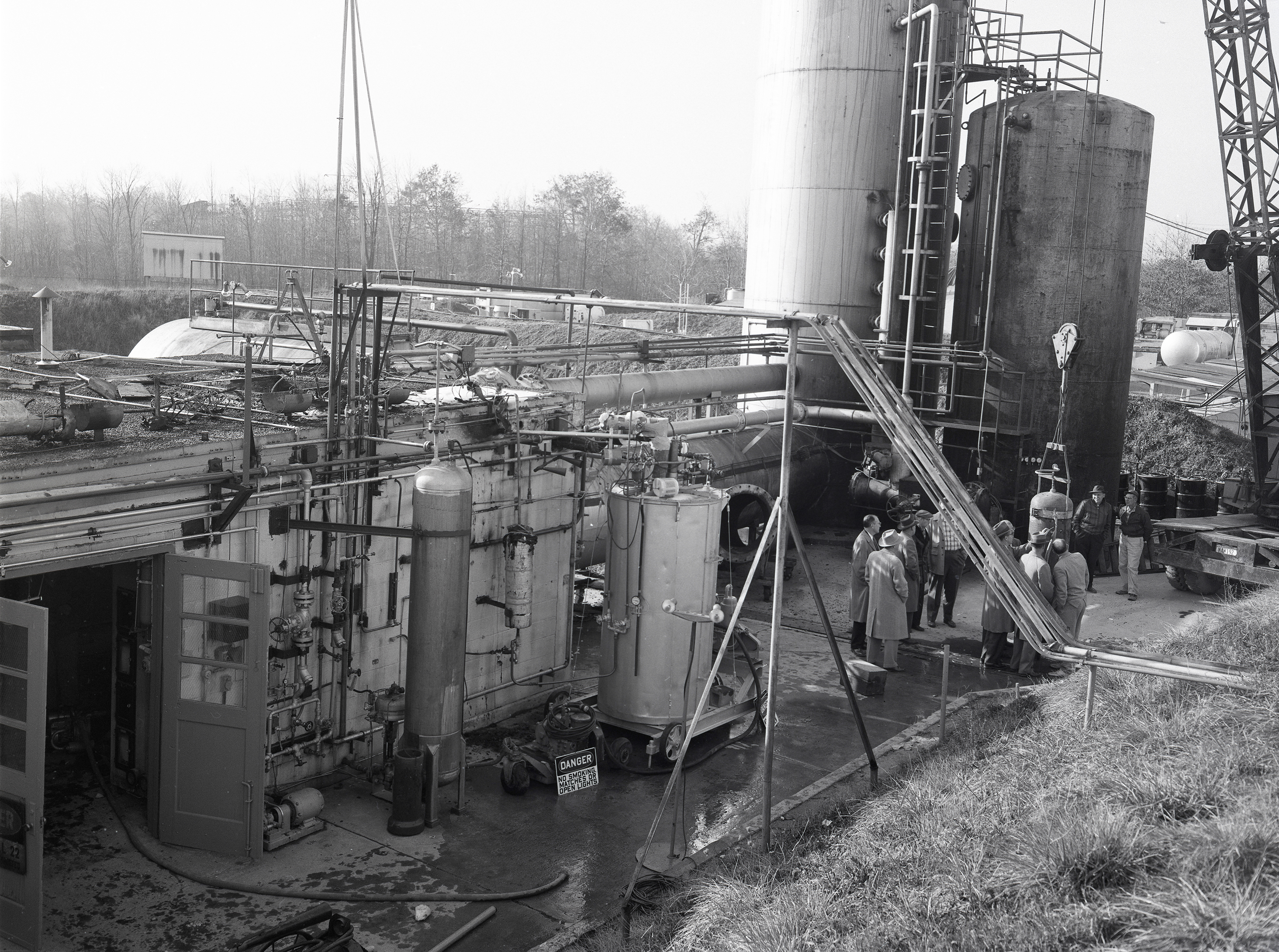 A group inspects damage to Cell 22 following the fluorine fire on November 5, 1957.